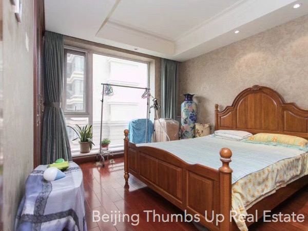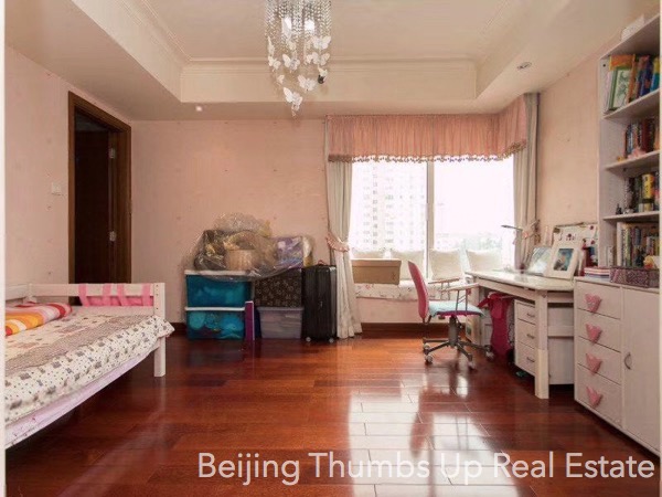 This apartment is located in Palm Springs in Chaoyang Park area, Beijing for rent. It has 3 bedrooms and 1 nanny room with an area of 240 square meters. It is fully furnished with all necessary furniture and household appliances. It is transparent layout, well ventilated and very comfortable. The living room is arc-shaped with a large floor window, the view is very wide, directly facing the atrium garden of the compound, it's like being in nature.