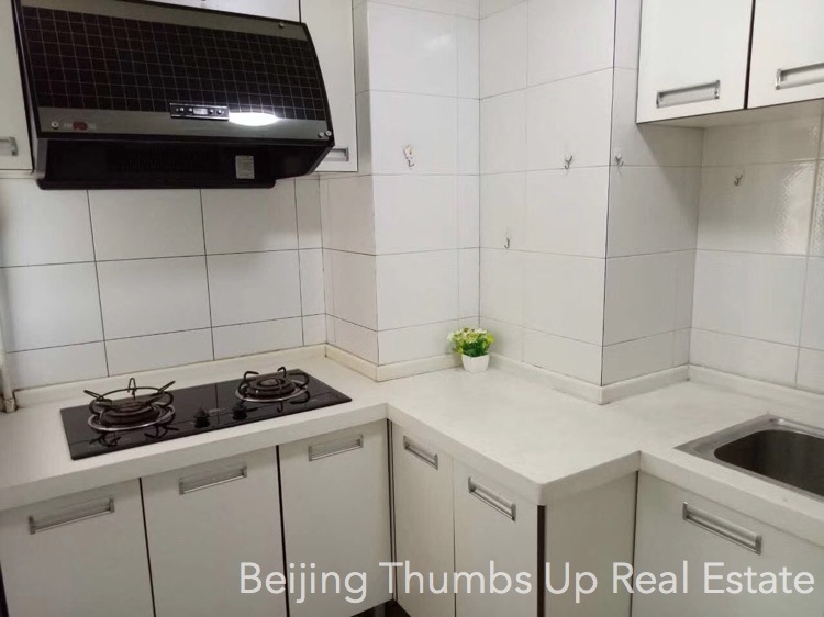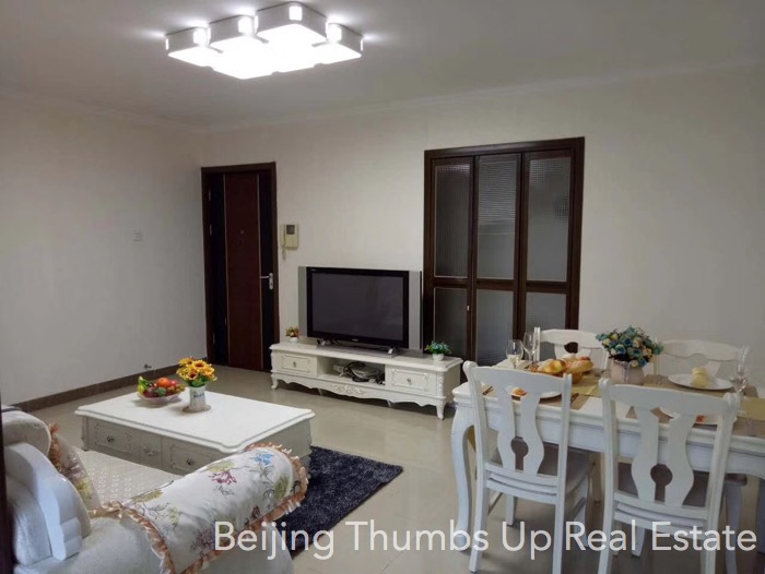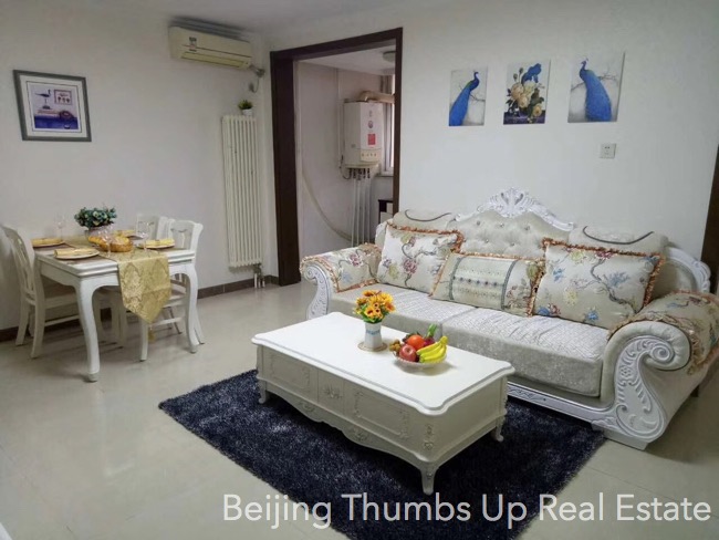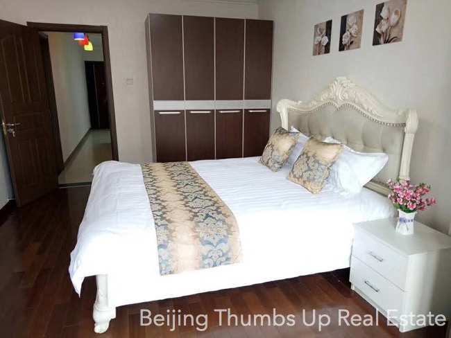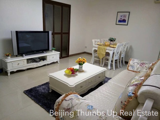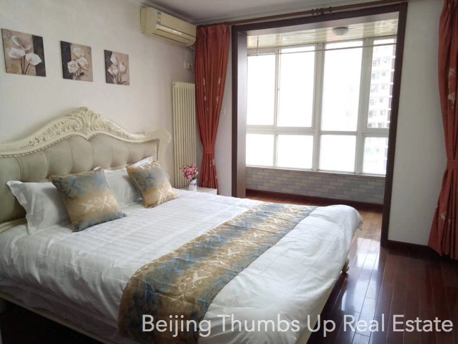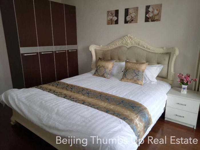 This is a European style apartment located in Lishui Garden in Chaoyang Park area, Beijing for rent. It has 1 bedroom, with an area of 88 square meters. It is fully furnished with European style furniture. There is a multi-functional extra area at the window of the bedroom, which can be served as a leisure area, or as a place for sun drying clothes, very practical.