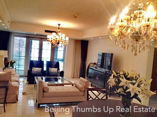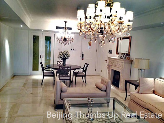 This apartment is located in Palm Springs in Chaoyang Park area, Beijing for rent. It has 2 bedrooms, covers an area of 175 square meters. The decoration and configuration of this apartment cost millions of RMB. The floors of the bedrooms are covered with expensive carpets. The lamps in the living room and dining room are very luxury. This apartment has a large enclosed balcony next to the living room. Are you interested in this apartment?