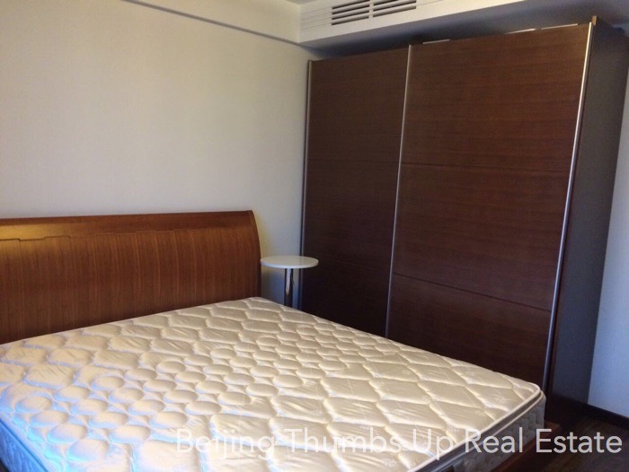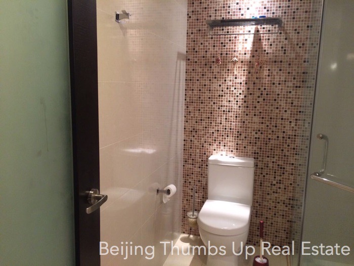 This is a Chinese style apartment located in East Avenue in Beijing Sanlitun for rent. It has 1 bedroom, covers an area of 86 square meters. It is fully furnished with all necessary Chinese style furniture. It has a popular open kitchen. There is a small circular workbench which can also be used as a dining table as well as 2 bar chairs in the kitchen. The mosaic inlaid on the wall behind the toilet is very bright and beautiful. This apartment uses central air condition to adjust the indoor temperature.