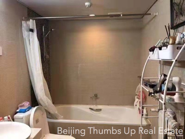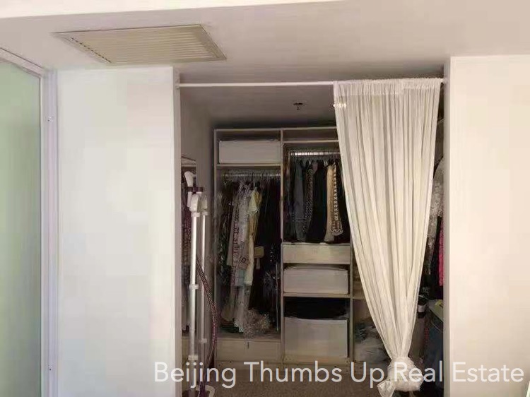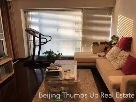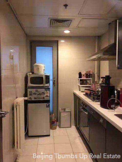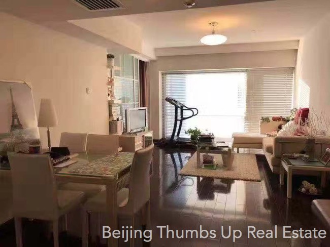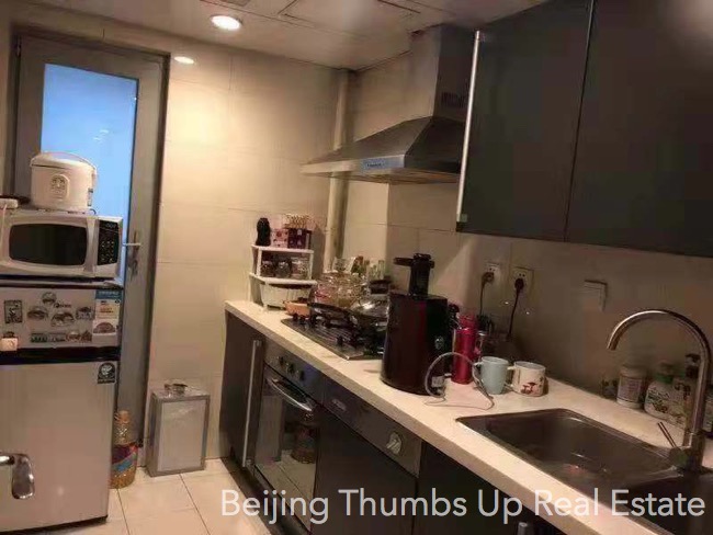 This is a modern simple style apartment located in Fortune Plaza in Beijing CBD. It has 1 bedroom with an area of 96 square meters. It is fully furnished with all necessary furniture and household appliances. It has a walk in closet, very convenient. The kitchen is fully equipped, even with a dishwasher. There is a treadmill in the living room.