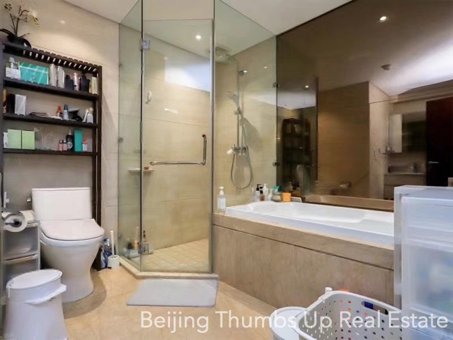 This is a semi luxury style apartment located in Shoukai Bojun in Sanlitun area, Beijing. It has 1 bedroom, 1 living room, 1 dining room, 1 kitchen and 1 bathroom with an area of 128 square meters. It is south orientated with an open kitchen. It has high end suspended ceilings with stylish lamps, luxury walls of difference styles, polished marble floors and high grade furniture. The difference of this apartment is that both the living room and the bedroom have an additional leisure area, very relaxed. In the bathroom, there is a big bathtub and a shower room, which are separate from each other, very convenient.