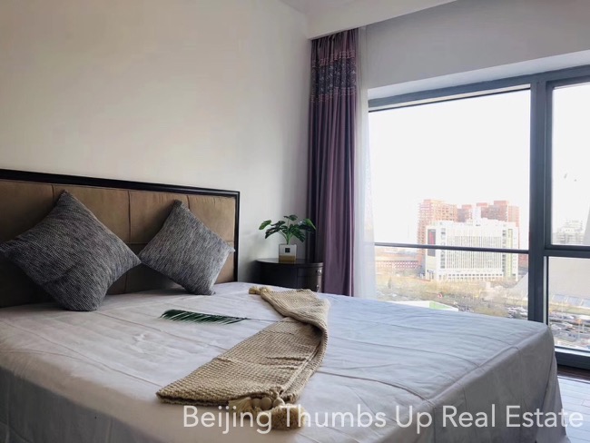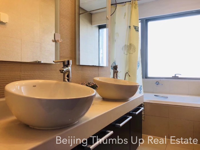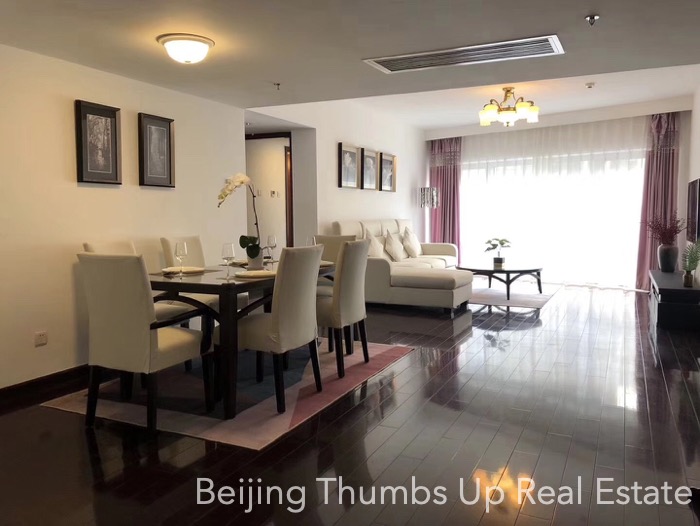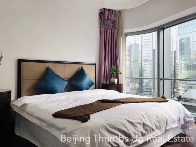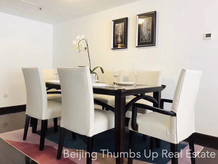 This is a modern Chinese style apartment located in Fortune Plaza in Beijing CBD. It has 3 bedrooms, with an area of 166 square meters. It is on the high floor with a nice view. It is southeast orientated, sufficient sunlight during the day.