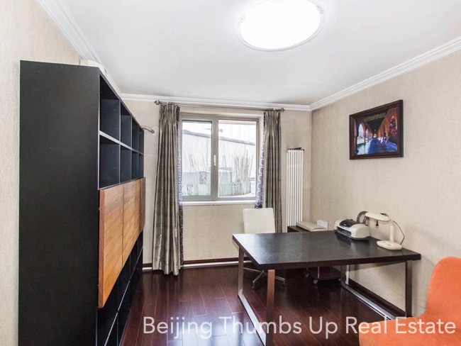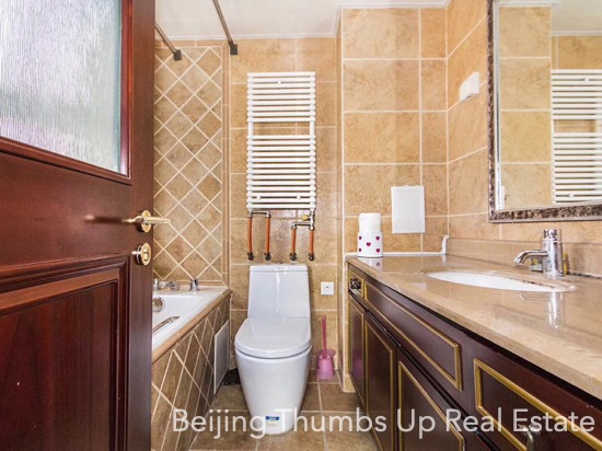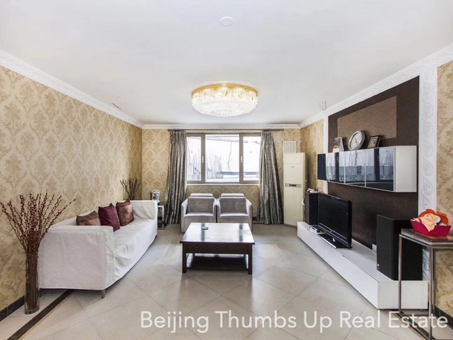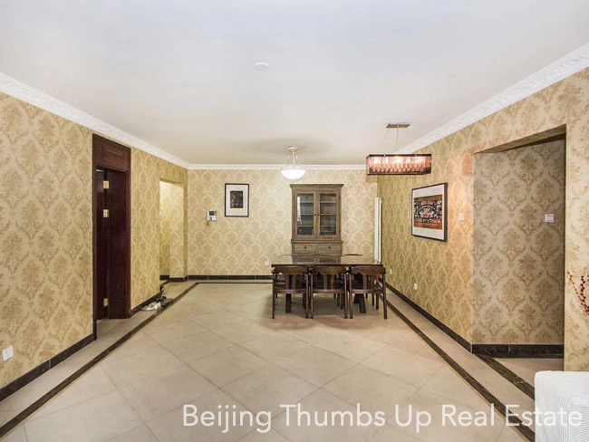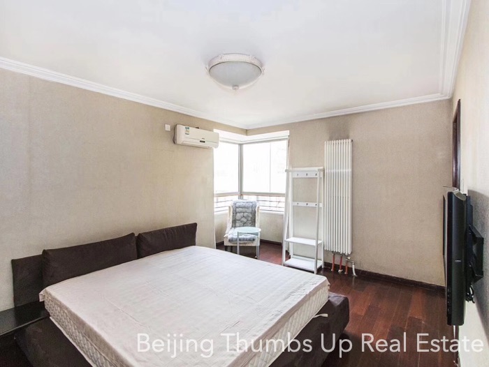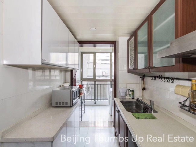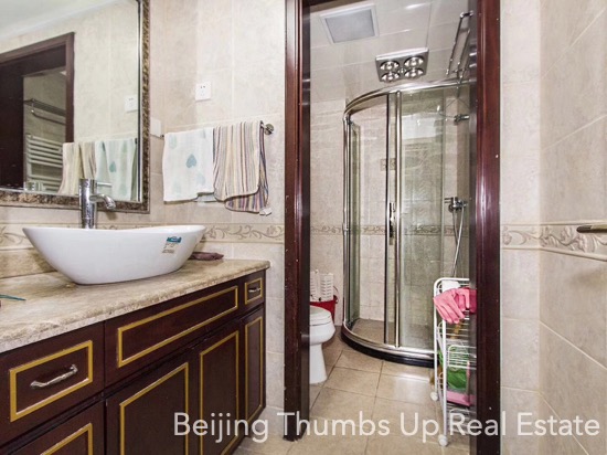 This apartment is located in Park 5 in Chaoyang Park area, Beijing. It has 3 bedrooms, with an area of 165 square meters. It is furnished with all necessary furniture. There is a bright laundry room near the kitchen. In the master bathroom, there is a bathtub. Every room of this apartment is well maintained.