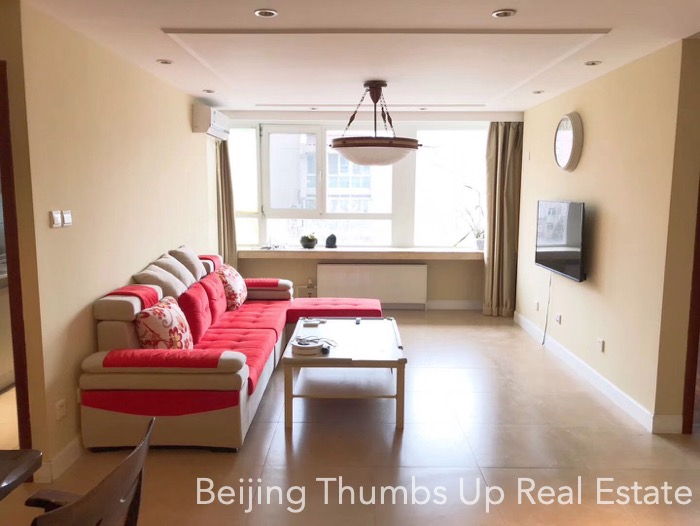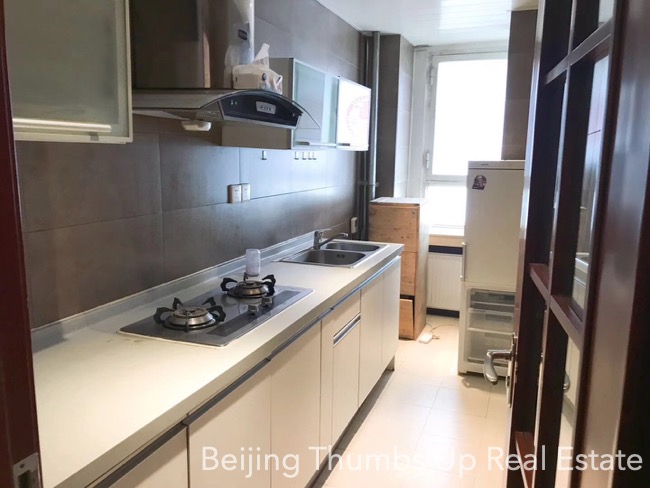 This is a nice apartment located in International Wonderland in Sanlitun area, Beijing for rent. It has 2 bedrooms, 1 living room, 1 dining room, 1 kitchen and 2 bathrooms, with an area of 142 square meters. It is on the high floor, fully furnished. In the master bathroom, there is a bathtub. This apartment has air condition in summer and heater in winter.