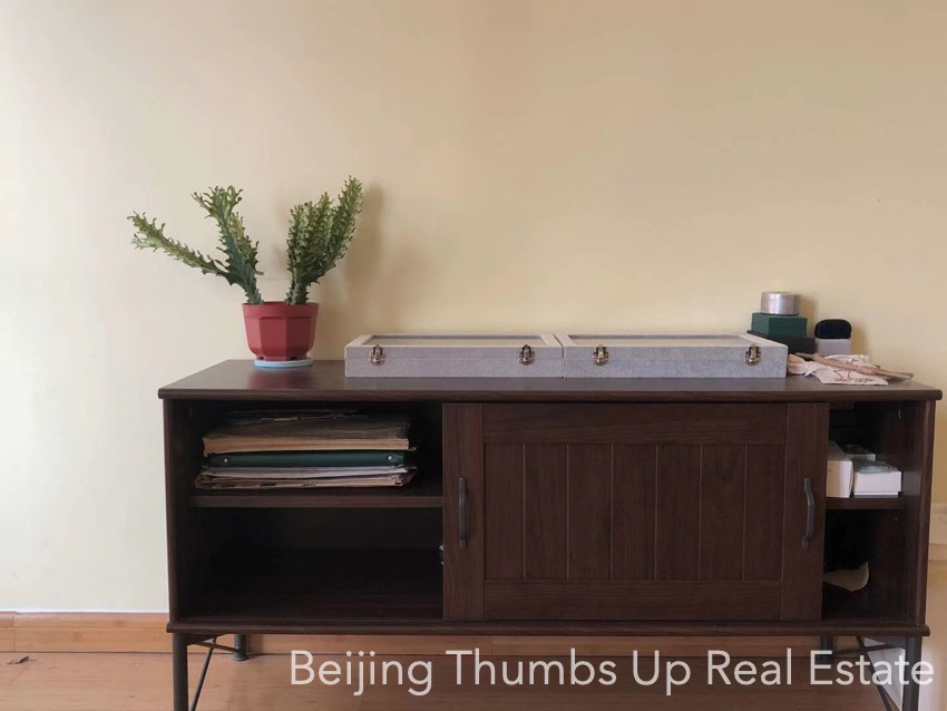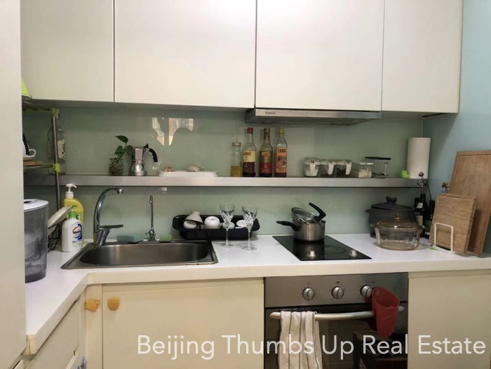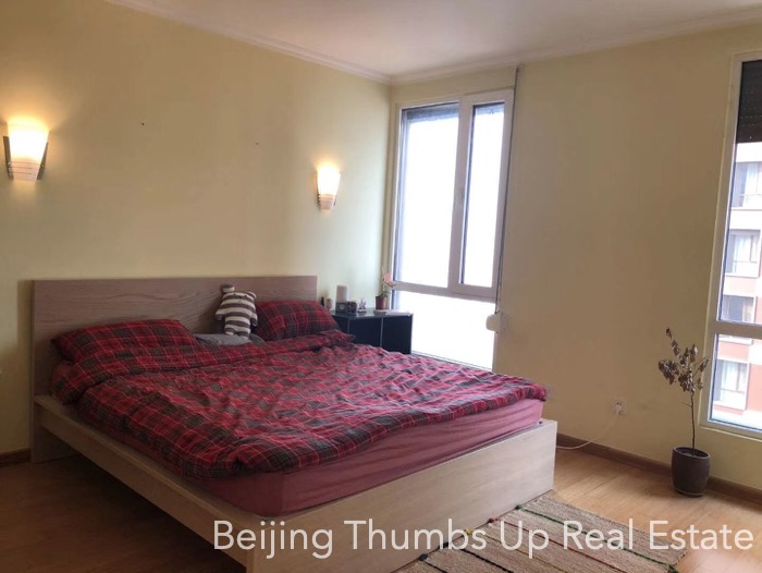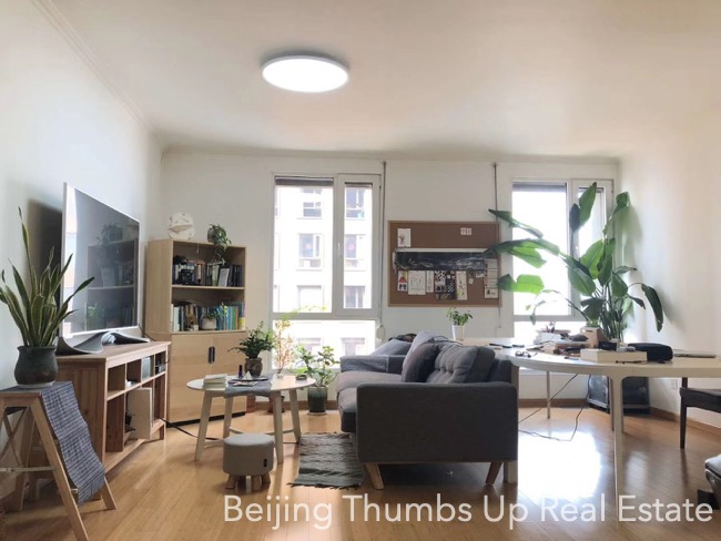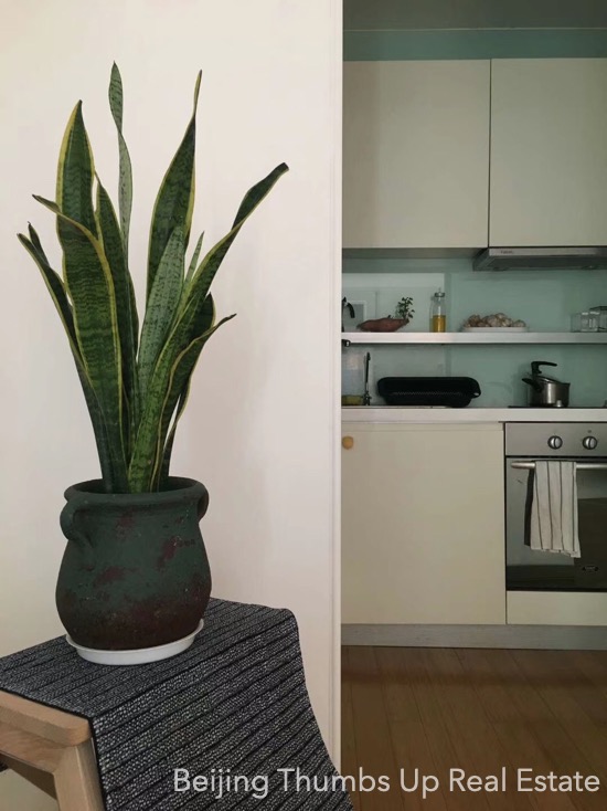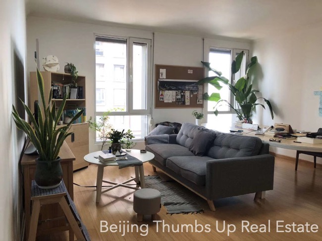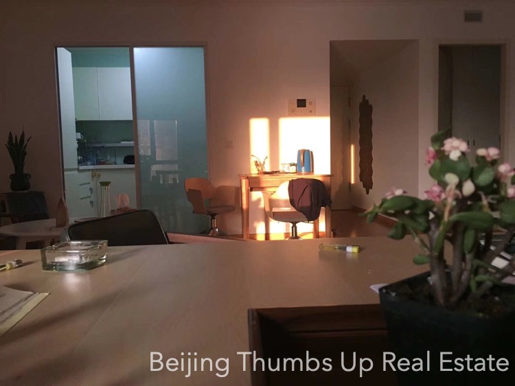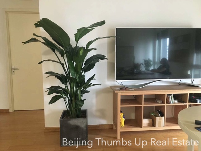 This is a modern simple style apartment located in POP MOMA in Beijing Dongzhimen. It has 2 bedrooms with an area of 85 square meters. It is furnished with all necessary furniture. The kitchen is equipped with a big oven, an induction cooker, a range hood and a fridge of large capacity. There is no gas supply in this apartment. The potted flowers and green plants make the apartment full of vitality. The living room and master bedroom all have 2 large windows, good daylight during the day.
