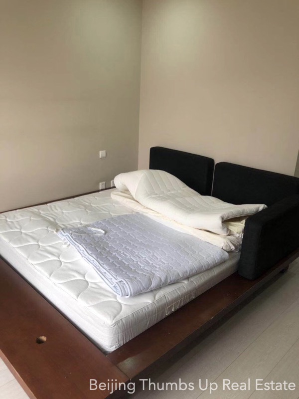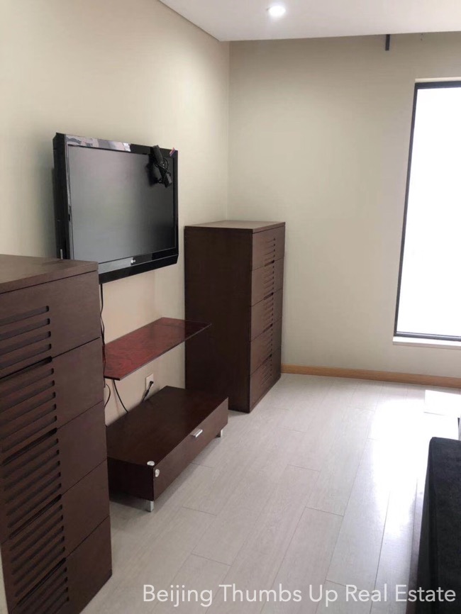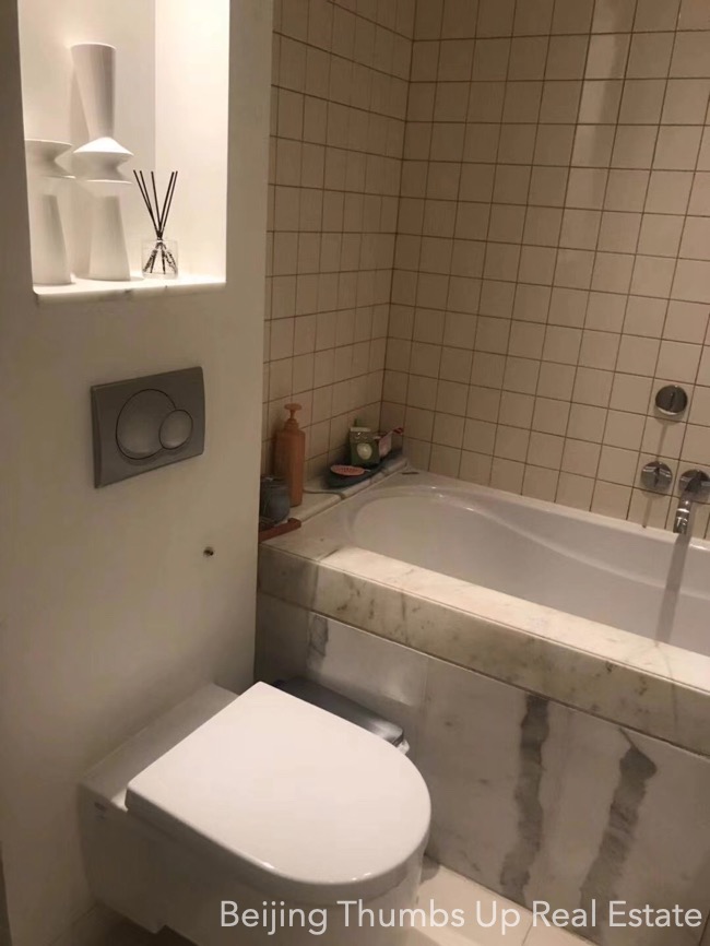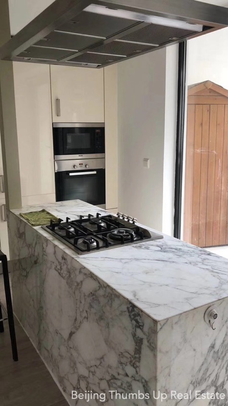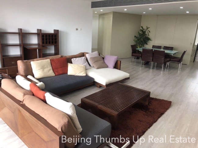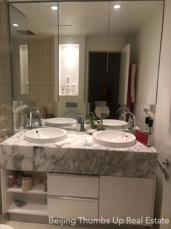 This is a high floor apartment located in Victoria Garden in Chaoyang Park area, Beijing for rent. It has 3 bedrooms, 1 living room, 1 dining room, 1 kitchen and 2 bathrooms, with an area of 205 square meters. It is fully furnished with Chinese style furniture and Miele household appliances. It is north to south transparent layout, well ventilated and sufficient sunlight during the day. It has 2 open balconies, the big one is outside the living room, and the small one is outside the kitchen. The workbench countertop and facade in the kitchen, and the washbasins and bathtub countertops and facades in the bathrooms are all made of polished marbles, very firm and high end. This apartment has a fresh air system.
