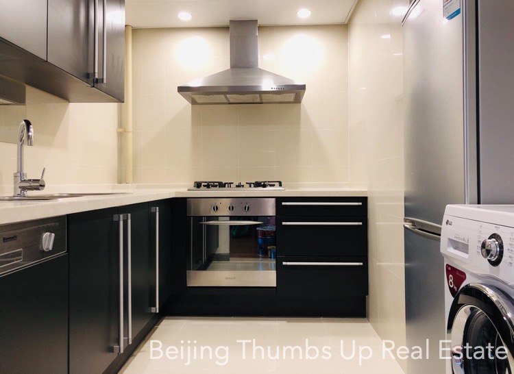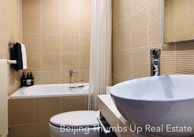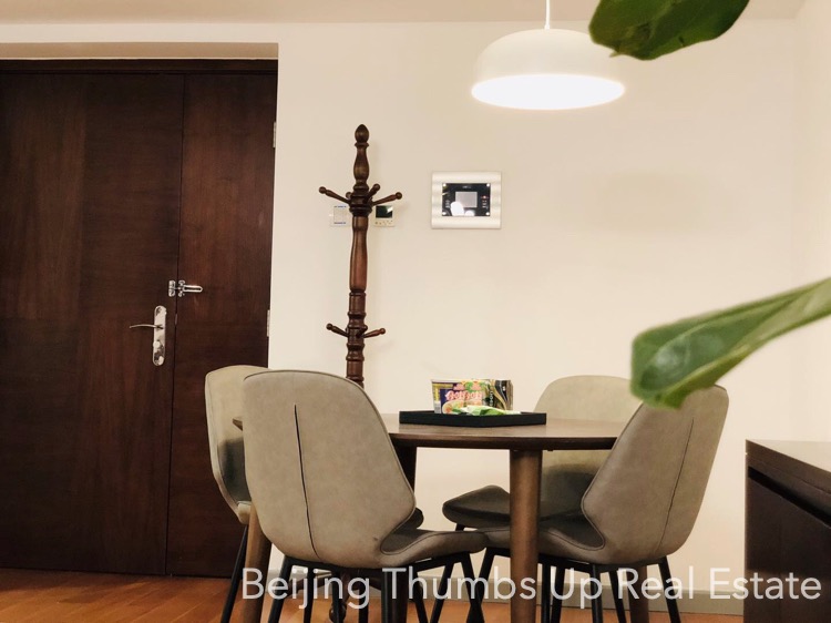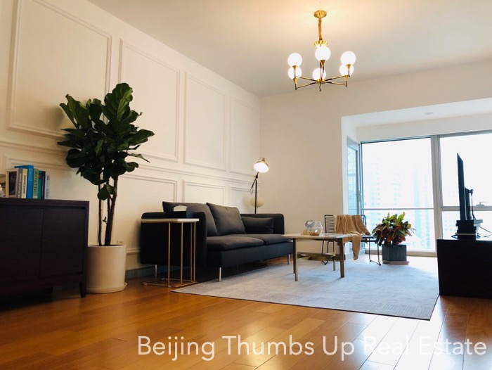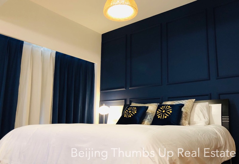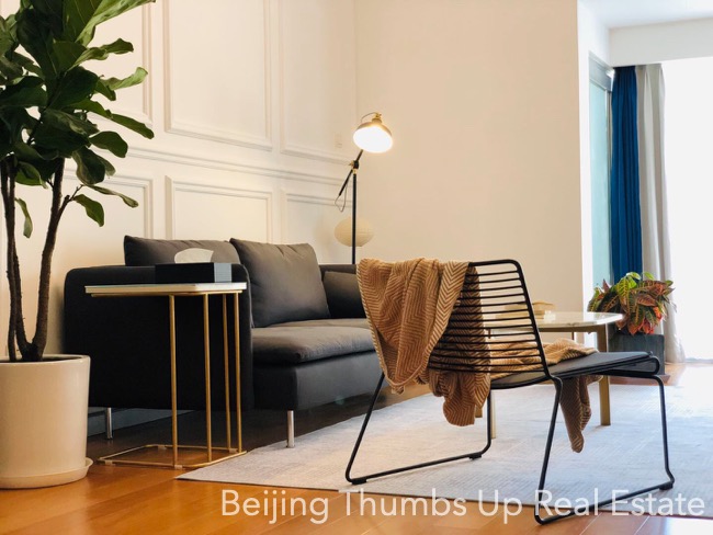 This is a Nordic style apartment located in Fortune Plaza in Beijing CBD for rent. It has 1 bedroom, with an area of 88 square meters. It is fully furnished, on the high floor with a nice view. The living room has a large floor window, sufficient sunlight during the day. The kitchen is equipped with a big oven, a gas stove with multiple burners, a range hood, a dishwasher and a large capacity refrigerator. The washing machine is in the kitchen. The sofa wall in the living room and the bedside wall in the bedroom are very distinctive. The walls of the kitchen and bathroom are decorated with high-grade bricks, very noble.
