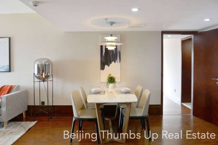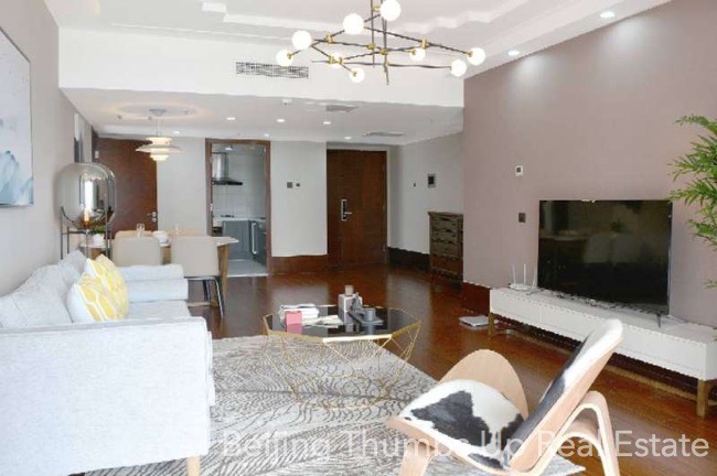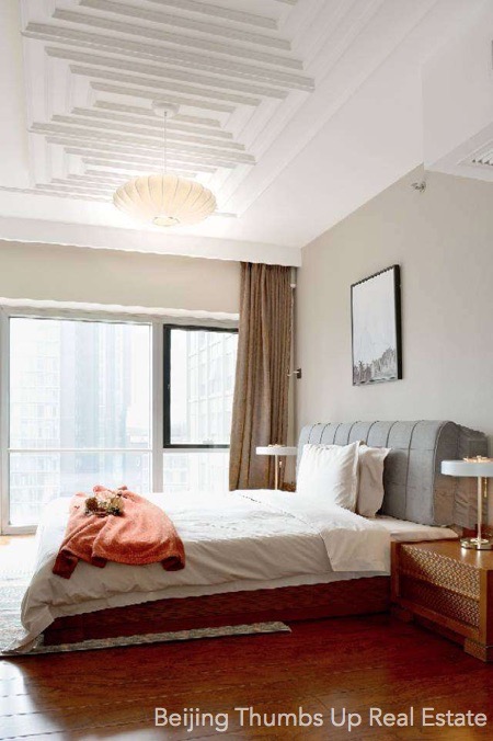 This is a Nordic style apartment located in Fortune Plaza in Beijing CBD for rent. It has 2 bedrooms with an area of 138 square meters. It is modern refined decorated with a high quality decoration standard. It is furnished with high grade furniture and modern household appliances. It has a nice layout, very comfortable. Every room has a big window, good daylight during the day. This apartment uses central air condition to adjust the indoor temperature.