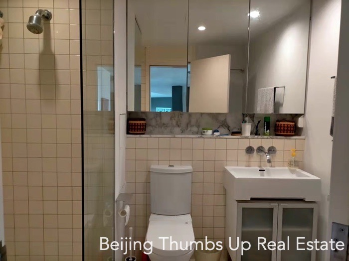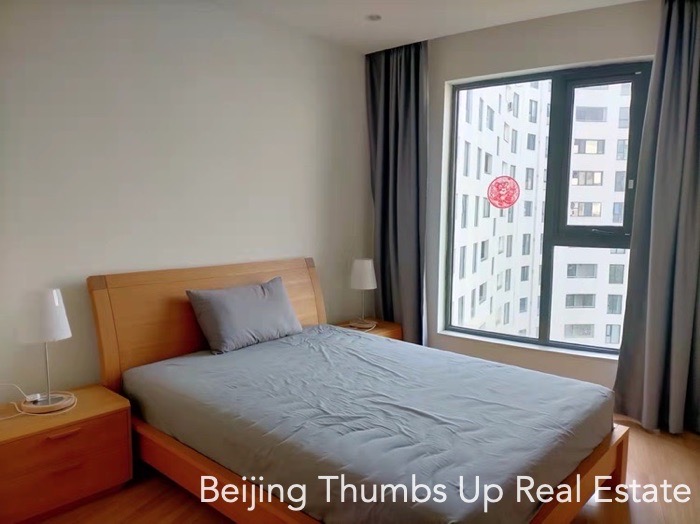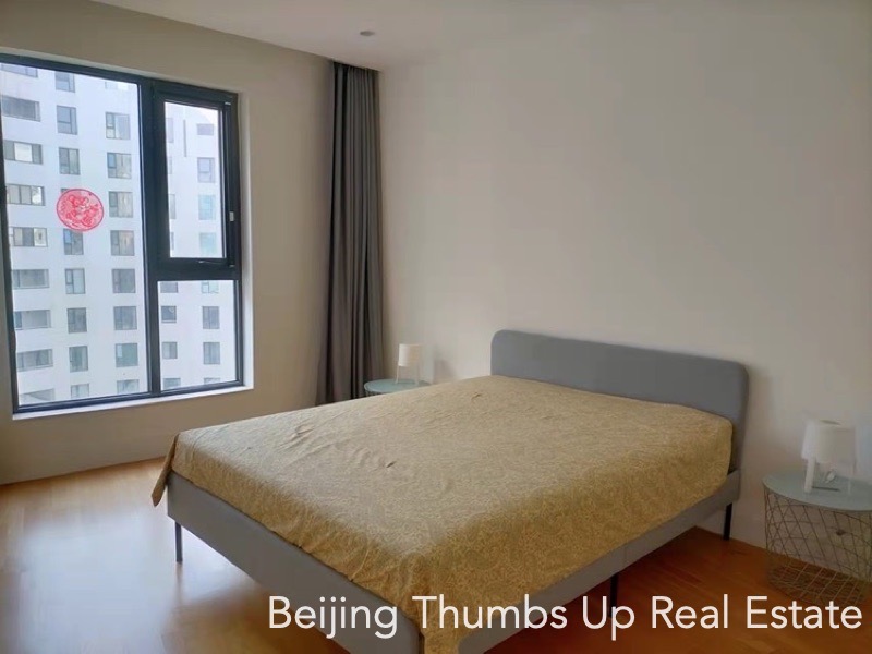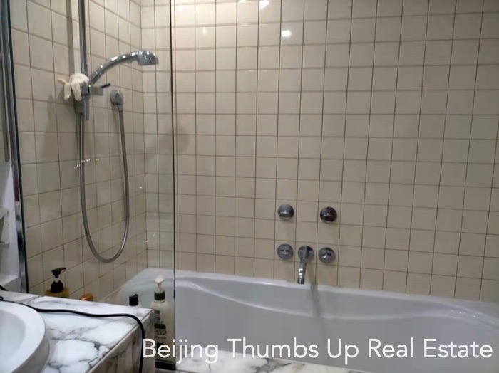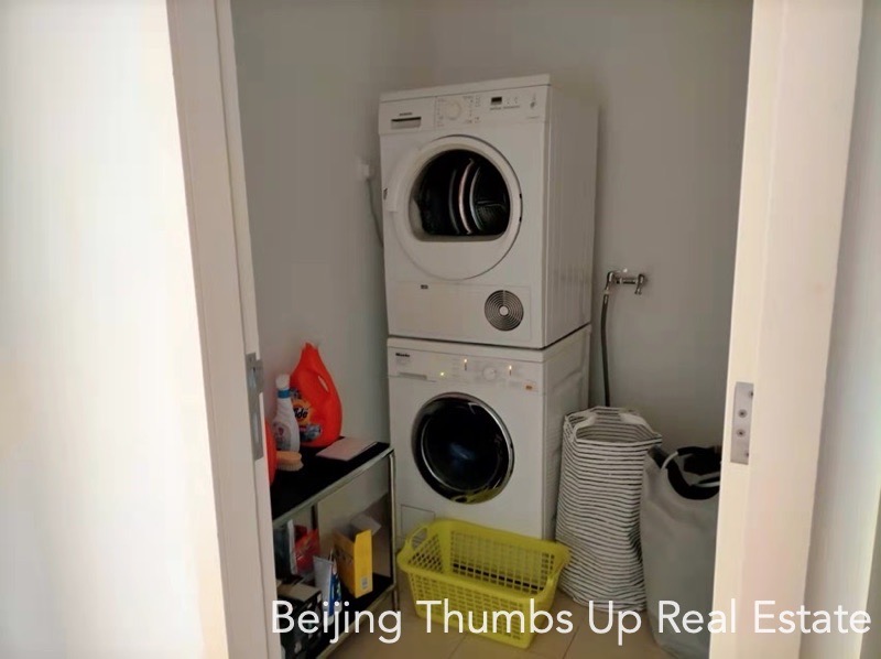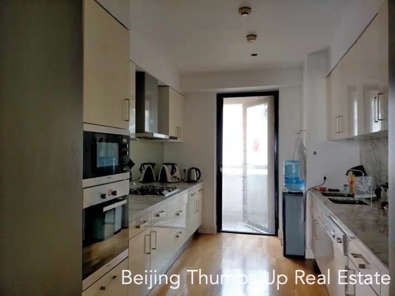 This is a modern simple style apartment located in Victoria Garden in Chaoyang Park area, Beijing for rent. It has 3 bedrooms, 1 study room, 1 living room, 1 dining room, 1 kitchen and 2 bathrooms, with an area of 220 square meters. It is transparent layout, well ventilated and very comfortable. It has 2 outdoor balconies, the large one is outside the living room with a nice view, and the small one is outside the kitchen. It has a freestanding laundry room. The kitchen is well equipped, and the countertops in the kitchen are all made of marble, very high end.