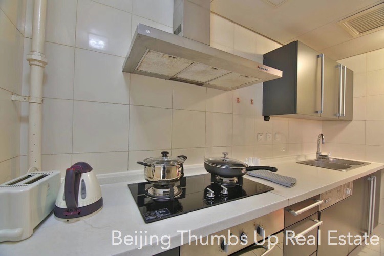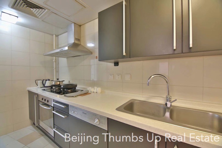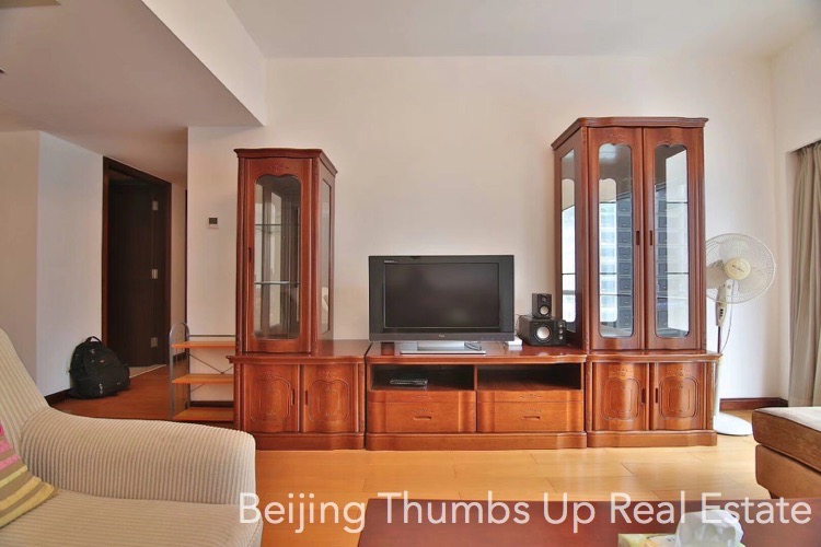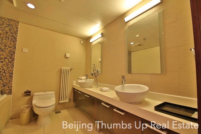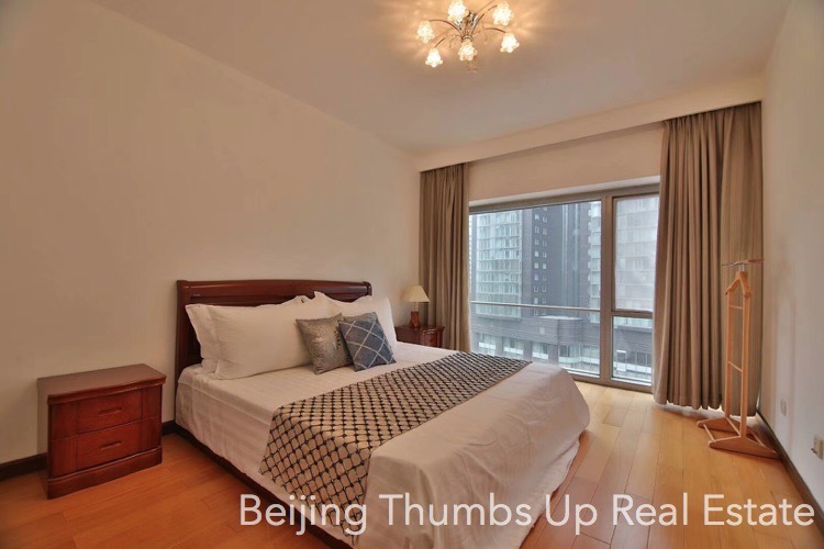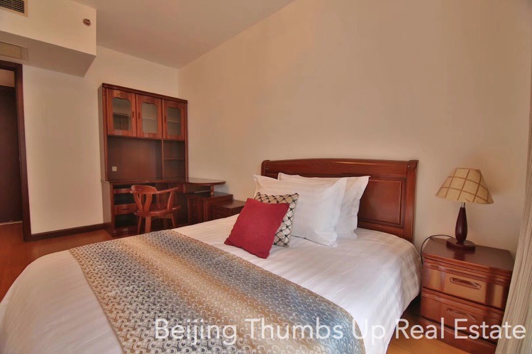 This is a Chinese style apartment located in Fortune Plaza in Beijing CBD for rent. It has 2 bedrooms with an area of 142 square meters. It is fully furnished with Chinese style furniture and modern household appliances. The living room and bedrooms all have a floor window, the lighting is good during the day. The kitchen is fully equipped with a full set of modern kitchen equipment, including an embedded oven, a gas stove with double burners, a range hood, a microwave oven, a dishwasher and a refrigerator. The master bathroom is very spacious with 2 washbasins and 1 bathtub.