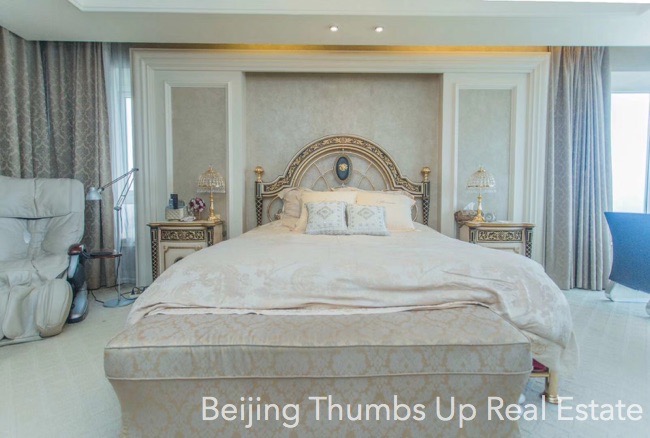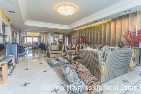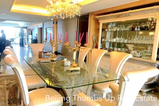 This is a super luxury style apartment located in Palm Springs in Chaoyang Park area, Beijing for rent. It has 4 bedrooms with an area of 370 square meters. It is transparent layout, well ventilated and very comfortable. It is luxuriously decorated and furnished. It has luxury hung ceilings, gorgeous walls of different styles, polished marble floors with patterns, luxury lamps, high grade curtains, luxury furniture, valuable ornaments and modern household appliances. The living room and dining room all have a floor window, the view is wider and the lighting is better. The master bedroom has multi large windows with sufficient sunlight during the day. The layout of this apartment is the best in Palm Springs with a panoramic view of Chaoyang Park.