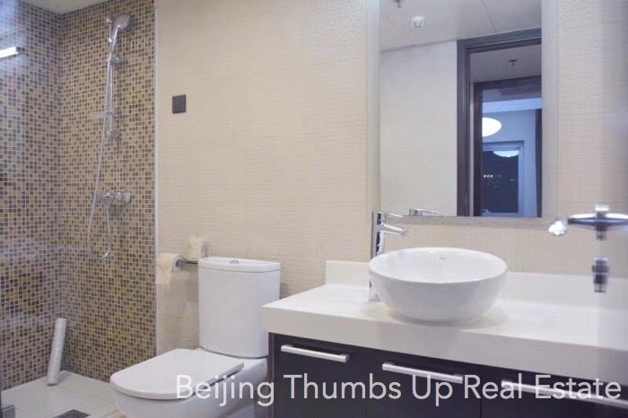 This is a Nordic style apartment located in Fortune Plaza in Beijing CBD for rent. It has 3 bedrooms and 2 bathrooms, covers an area of 152 square meters. It is newly renovated and fully furnished with brand new furniture and household appliances. The living room and bedrooms all have a floor window, the view is wider and the daylight is better. The kitchen is great, and well equipped with an embedded oven, a gas stove of double burners, a range hood, a microwave oven and a dishwasher. The refrigerator is in the dining room. In the master bathroom, there is a bathtub and a window. The rent includes property management and heating.