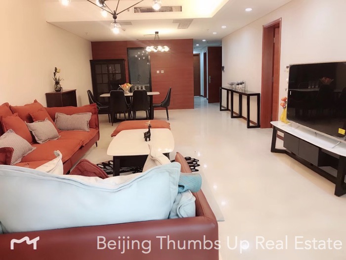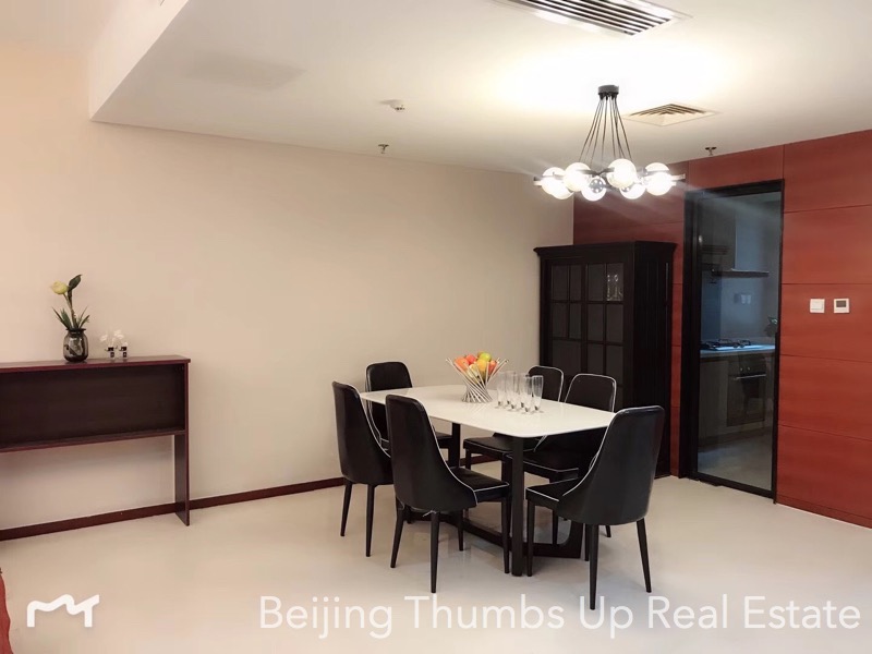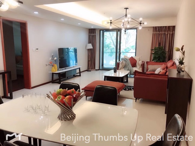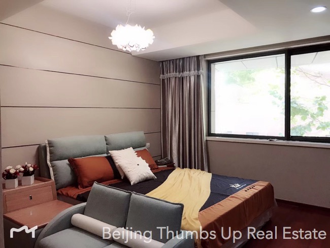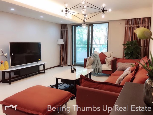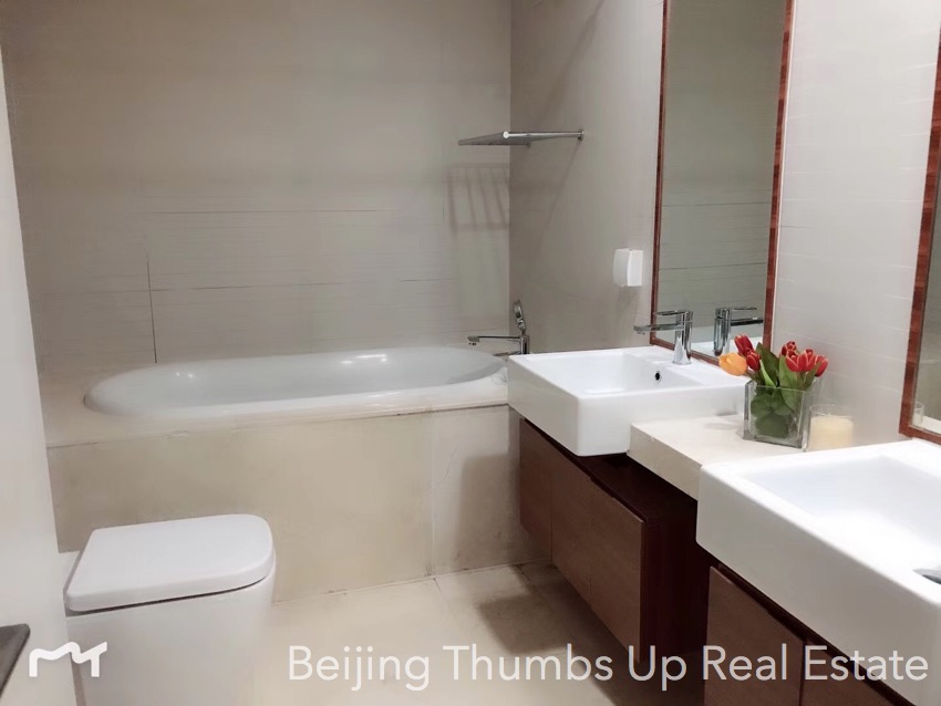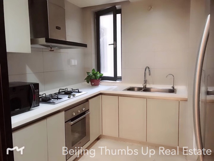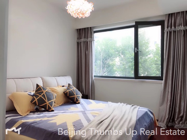 This is a Nordic style apartment located in Mixion Residence in Lufthansa area, Beijing for rent. It has 3 bedrooms with an area of 170 square meters. It is north to south transparent layout, well ventilated and very comfortable. It is on the low floor, very easy to see the green trees outside the windows, very relaxed. It is newly decorated and furnished with brand new high grade furniture and brand new household appliances. The lamps are very stylish, very attractive. The living room has a floor window, the view is wider and the daylight is better. The kitchen is well equipped with an embedded oven, a gas stove of double burners, a range hood, a microwave oven and a large capacity refrigerator of double doors. The master bathroom has a bathtub and double washbasins, very convenient.