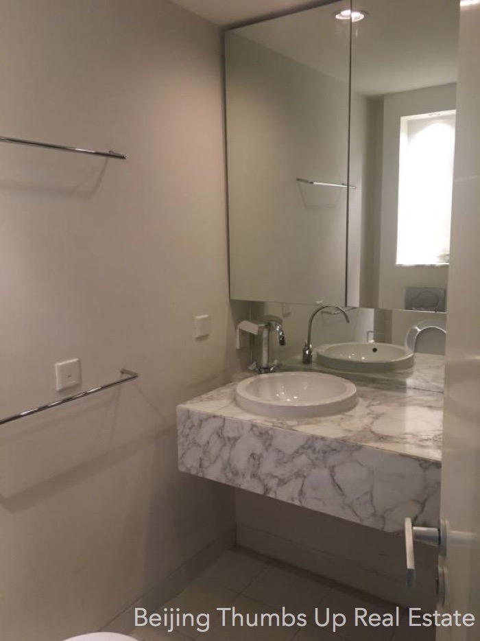 This is a partly furnished apartment located in Victoria Garden in Chaoyang Park area, Beijing for rent. It has 3 bedrooms, 1 living room, 1 dining room, 1 kitchen and 2 bathrooms, with an area of 160 square meters. This apartment has the following advantages: 1. It is transparent layout, well ventilated and very comfortable. 2. It has 2 outdoor balconies, the large one is outside the living room, and the small one is outside the kitchen. 3. The washbasin countertops and the bathtub countertop and facade in the bathrooms are all made of polished marbles, very high end. 4. In the master bathroom, there is a bathtub.
