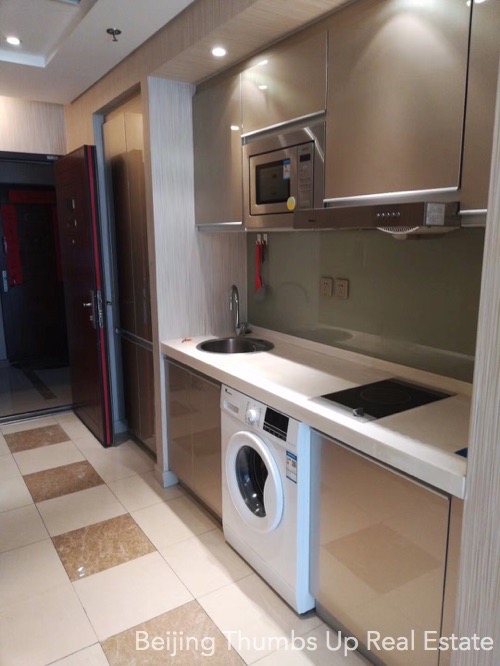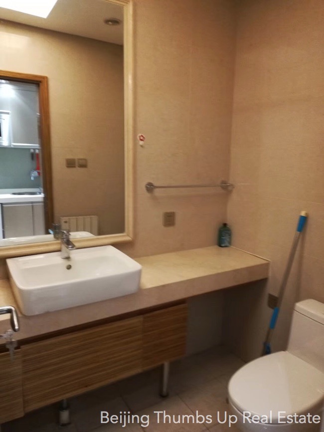 This is a modern simple style apartment located in Shoukai Bojun in Beijing Sanlitun. It has 1 bedroom, covers an area of 95 square meters. It is east facing, on the low floor. It is modern refined decorated and basically furnished. The kitchen is the popular open style, and equipped with an induction cooker, a range hood, a microwave oven and a large capacity refrigerator. This apartment has central air condition in summer and floor heating in winter.