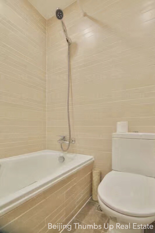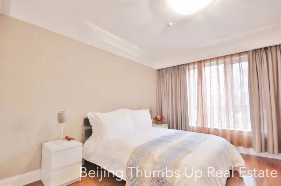 This apartment is located in Upper East Side in Lido area, Beijing for rent. It has 2 bedrooms, 1 living room, 1 dining room, 1 kitchen and 2 bathrooms, covers an area of 130 square meters. It is on the low floor with an easy view of the green trees outside the windows. It is transparent layout, well ventilated and very comfortable. It is fully furnished with all necessary furniture. The kitchen is spacious, very comfortable, and well equipped with a big oven, a gas stove of multiple burners, a range hood, a microwave oven and a fridge of large capacity.