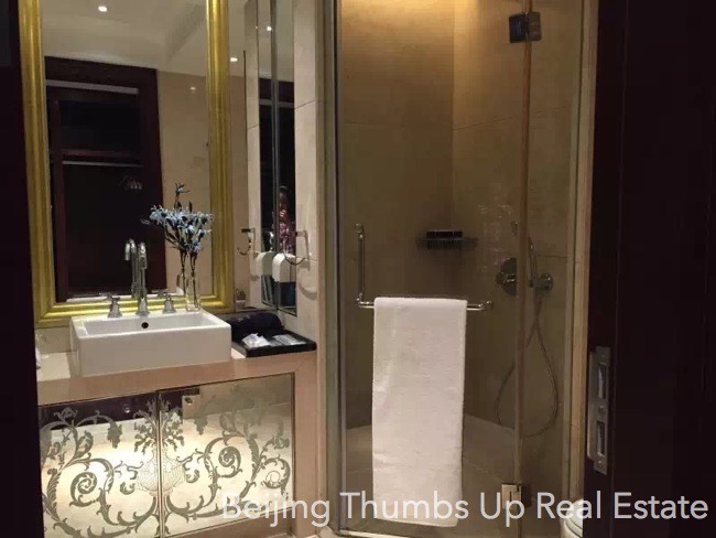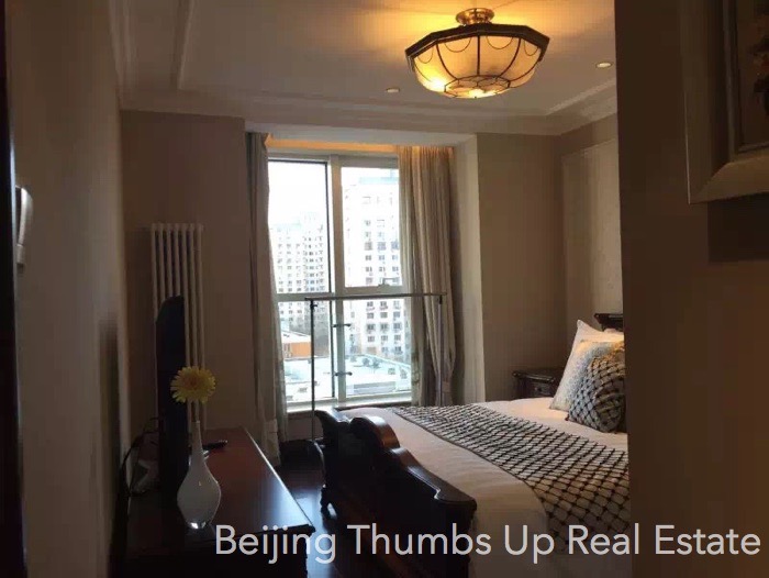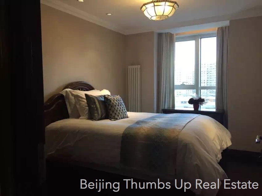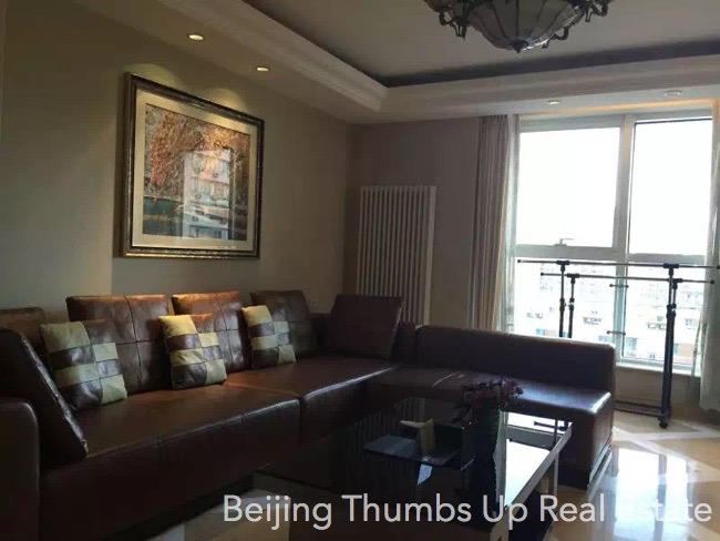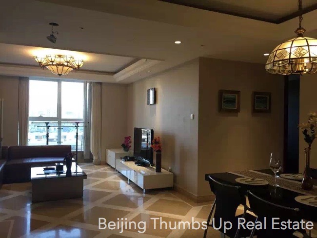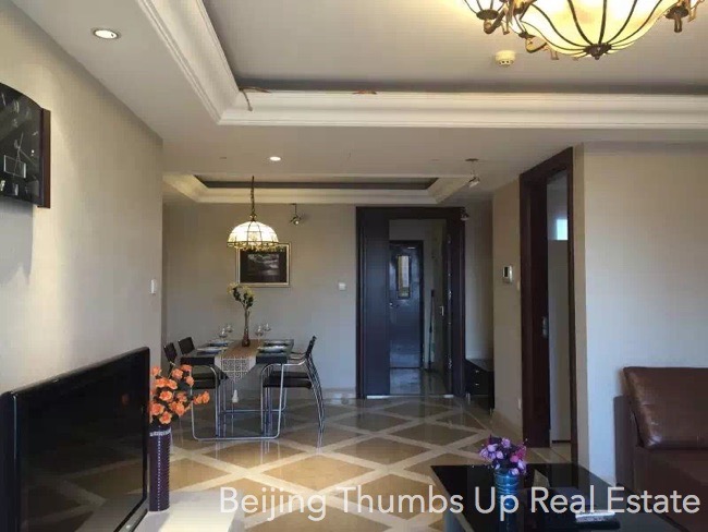 This apartment is semi luxury style located in Kylin Diplomatic Mansion in Chaoyangmen area, Beijing for rent. It has 2 bedrooms with an area of 120 square meters. It is south facing, on the middle high floor. It has high end hung ceilings, classical lamps, marble floors of diamond block pattern in the living room and dining room, real leather and solid wood furniture and modern household appliances. The floors of the bedrooms are solid wood floors, and the kitchen and bathroom are anti-skid floor tiles. This apartment is in good condition.