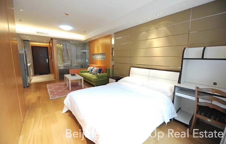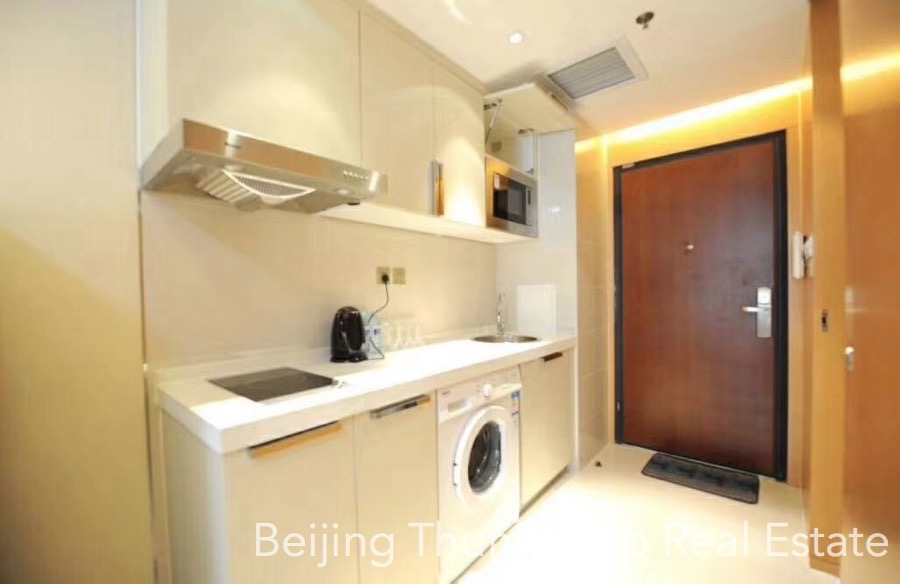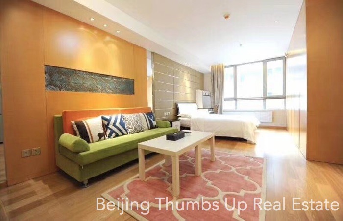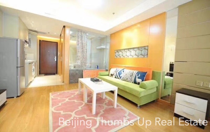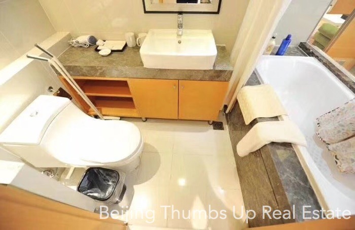 This studio apartment is located in Shoukai Bojun in Beijing Sanlitun. It covers an area of 75 square meters. It is modern refined decorated and fully furnished with high grade furniture. The kitchen is open style, and the washing machine in the kitchen. In the bathroom, there is a bathtub. Another advantage of this studio apartment is that the room is very bright during the day. Besides, this studio apartment is in good condition.