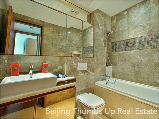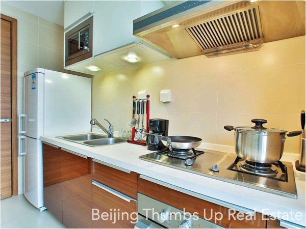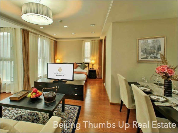 This is a studio serviced apartment located in Kylin Diplomatic Mansion in Chaoyangmen area, Beijing for rent. It covers an area of 72 square meters. It is modern refined decorated and furnished with high grade furniture and brand household appliances. The room has multiple large windows, good daylight during the day. The dining room, kitchen and bathroom have their own separate rooms. The kitchen is great, and well equipped with a big oven, a gas stove with double burners, a range hood, a microwave oven and a fridge. The bathroom is spacious, the wall is made of high-grade waterproof stones, and there is a bathtub in the bathroom. The rent includes property management, heating, invoice, 2 times cleaning a week, clubhouse for 1 person, energy fee up to 300RMB per month and breakfast.