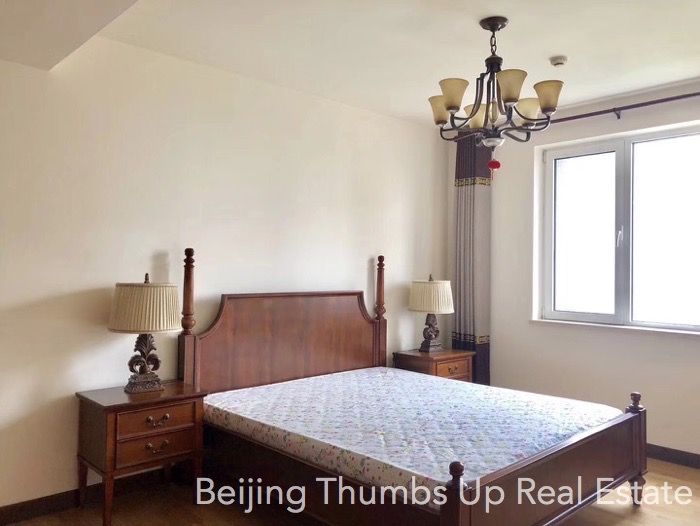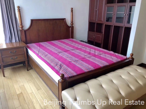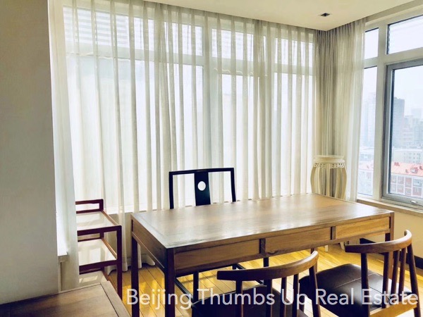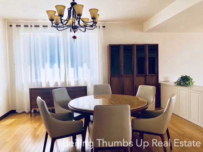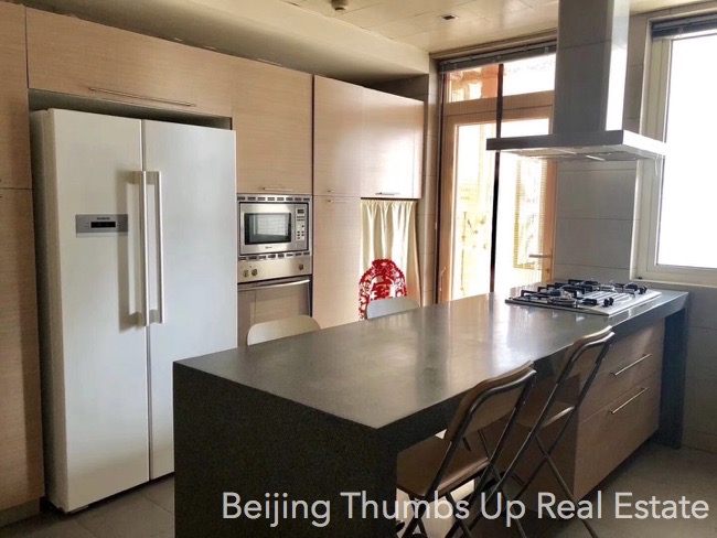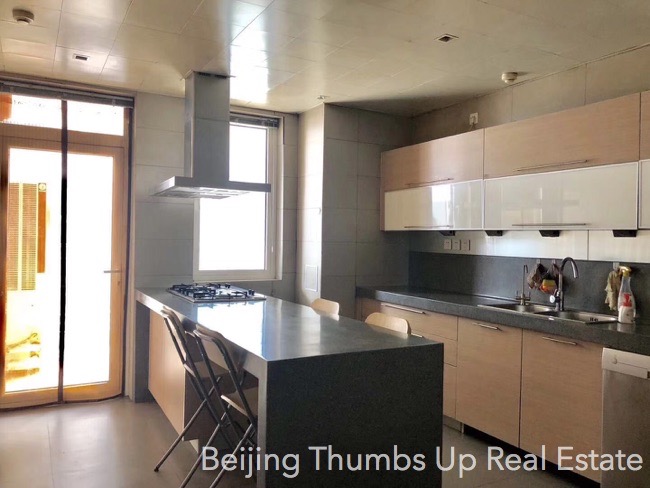 This apartment is located in Park Apartments in Chaoyang Park area, Beijing for rent. It has 3 bedrooms, 1 study room, 1 living room, 1 dining room, 1 kitchen and 3 bathrooms, with an area of 268 square meters. It is north to south transparent layout, well ventilated and very comfortable. It is on the high floor with a great view of Beijing CBD. The furniture of this apartment is all imported with high quality, and the lamps are very classical and traditional, very elegant. The kitchen is fully equipped, including a microwave oven, an embedded oven, a gas stove with multiple burners, a range hood, a dishwasher and a fridge. The fridge has large capacity with double doors, which can absolutely meet the needs of a family. In the middle of the kitchen, there is a large workbench, very convenient.