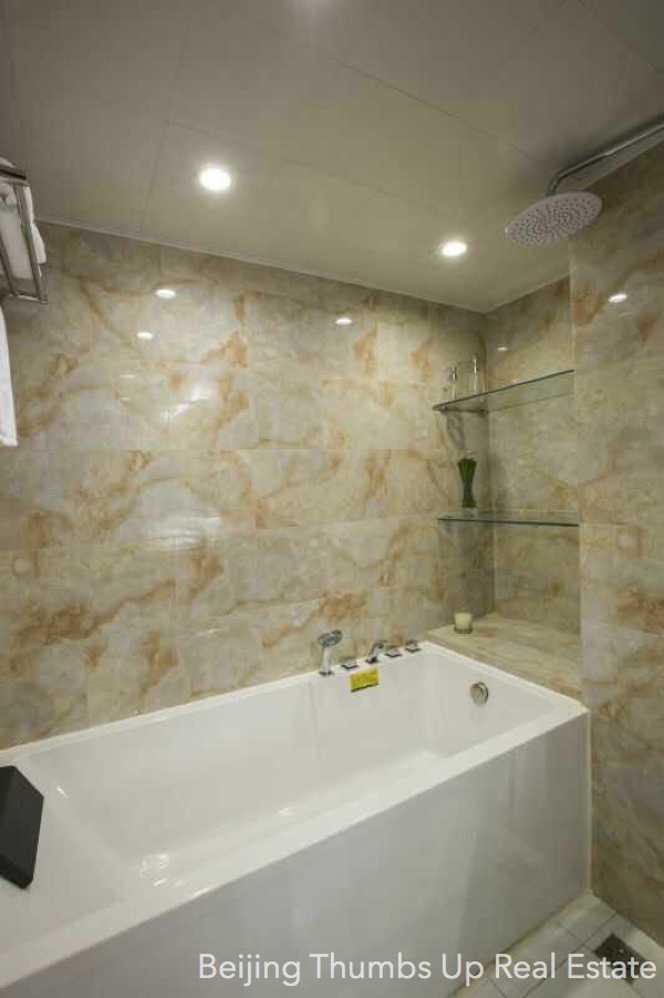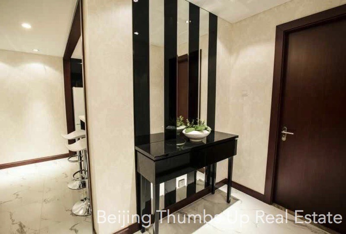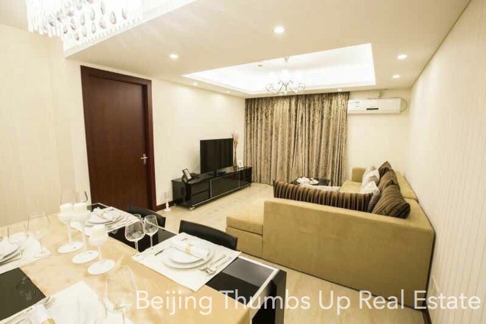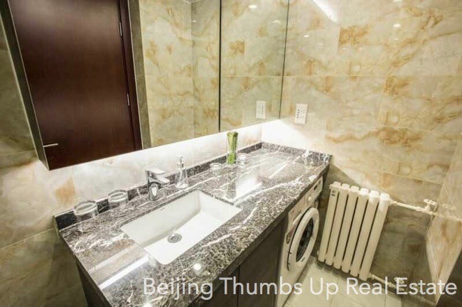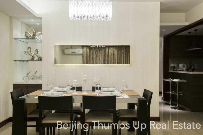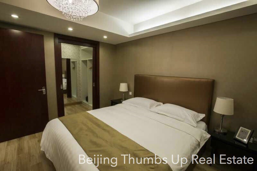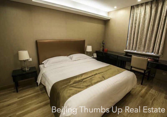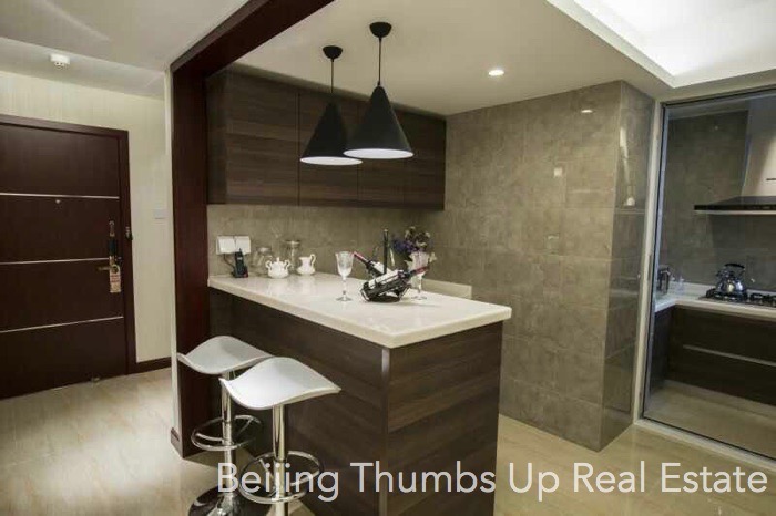 This is a serviced apartment of Chinese style located in Guangyao Apartment in Chaoyangmen area, Beijing for rent. It has 1 bedroom, covers an area of 90 square meters. It is modern refined decorated with polished marble floors and high end walls of different styles, and furnished with exquisite lamps, high end furniture and modern household appliances. The layout of this apartment is excellent, very comfortable. There is a small bar next to the kitchen, which can be used to entertain friends or hold a small party. The rent includes property management, heating, invoice, WIFI, cable TV and cleaning once a week.