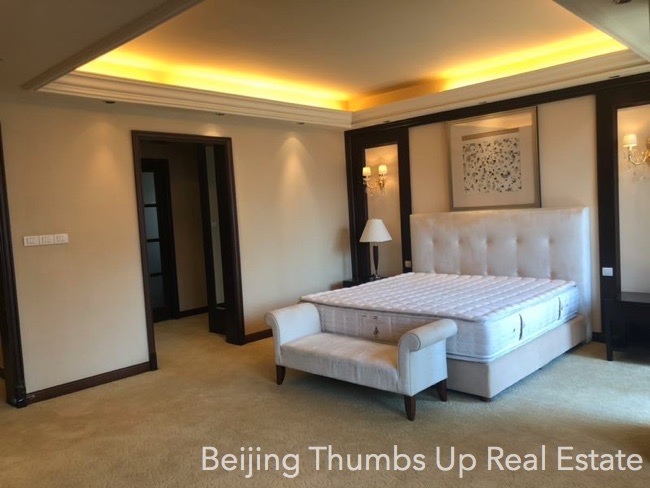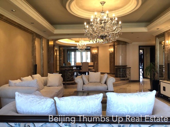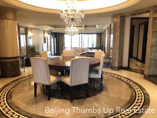 This is a luxury style apartment located in Start River in Qingnianlu area, Beijing for rent. It has 3 bedrooms and 1 study room, with an area of 352 square meters. It is luxuriously decorated with luxury hung ceilings, gorgeous walls of different styles and polished marble floors with patterns. The decoration stones of this apartment are all natural stones, very gorgeous, luxury and expensive. This apartment is fully furnished with luxury lamps, valuable murals and high-end brand furniture like the sofa, the dining table, the dining chairs, the beds and the carpet etc. Living in this apartment will have a luxurious and noble living experience.