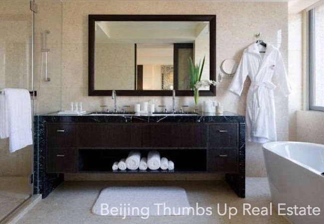 This is a serviced apartment of luxury Chinese style located in Marriott Executive Apartments in Beijing CBD. It has 3 bedrooms with an area of 233 square meters. It is luxuriously decorated with luxury walls of different styles. The floors of the kitchen and bathrooms are made of precious waterproof stones, very high-grade and luxurious. It is furnished with high grade Chinese style furniture. The lamp in the dining room is very luxurious and attractive. The living room has large floor windows, the view is wider and the daylight is better. The kitchen is the popular open style and well equipped. The bathroom is spacious and bright, and equipped with both a shower room and a bathtub. The rent includes property management, heating, TV, water, electricity, WIFI and cleaning twice a week.