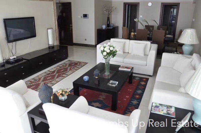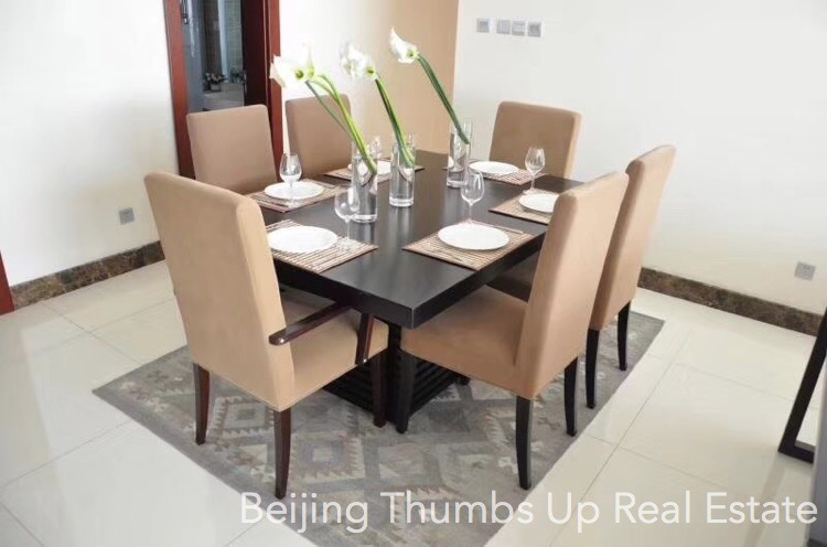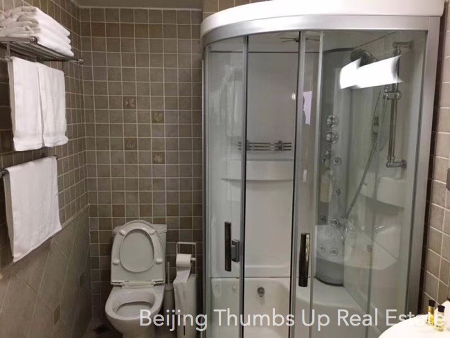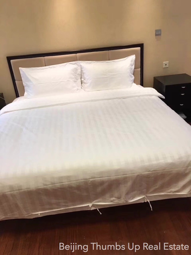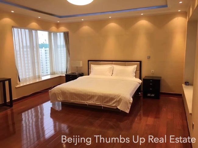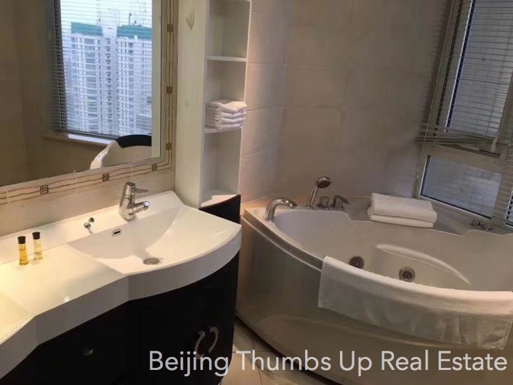This is a Chinese style apartment located in Palm Springs in Chaoyang Park area, Beijing for rent. It has 3 bedrooms and 2 bathrooms with an area of 180 square meters. It is on the high floor with a panoramic view of Chaoyang Park. It is fully furnished with Chinese style furniture. In the master bathroom, there is a large bathtub with massage function.