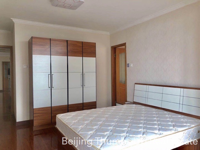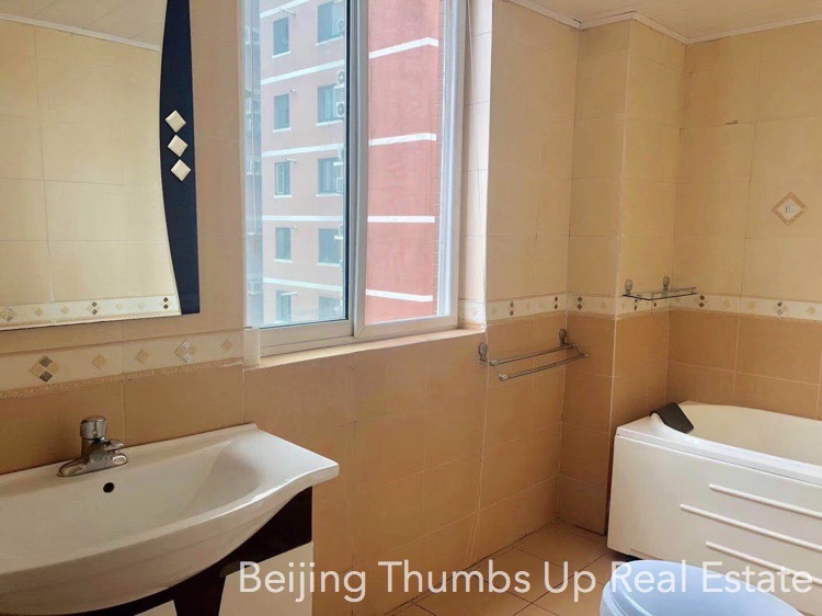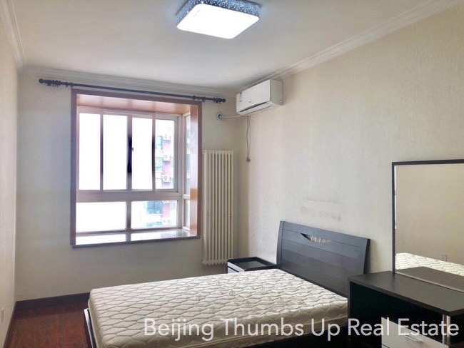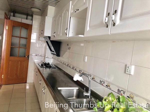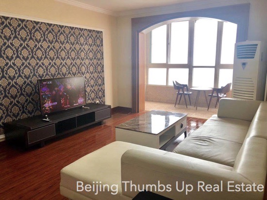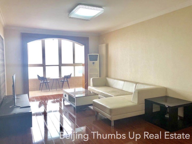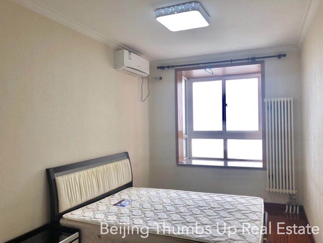 This is a modern simple style apartment located in Lishui Garden in Chaoyang Park area, Beijing for rent. It has 3 bedrooms, 1 living room, 1 dining room, 1 kitchen and 2 bathrooms, covers an area of 168 square meters. It is on the high floor with a nice view. It is fully furnished with all necessary furniture. There is a leisure area at the window of the living room, very relaxed and comfortable.