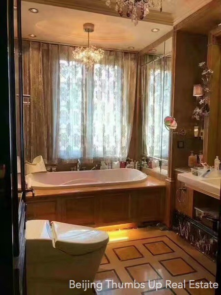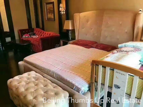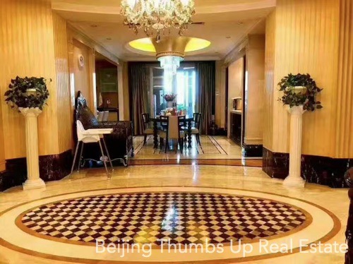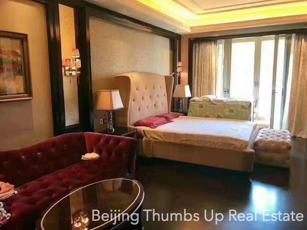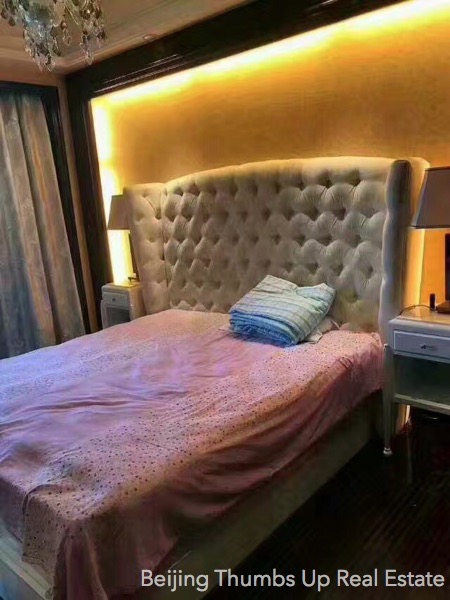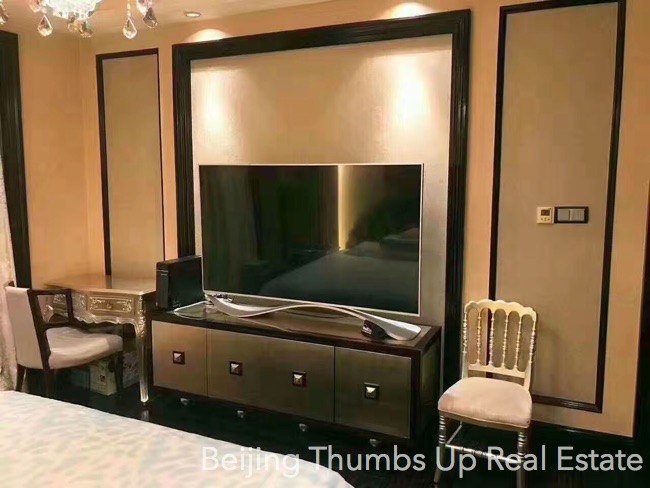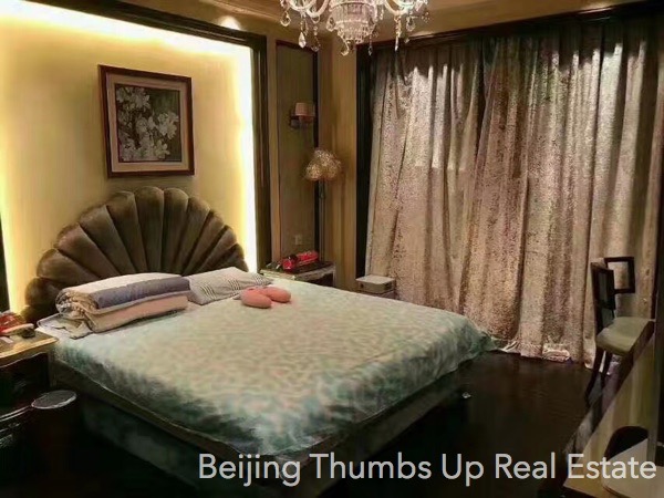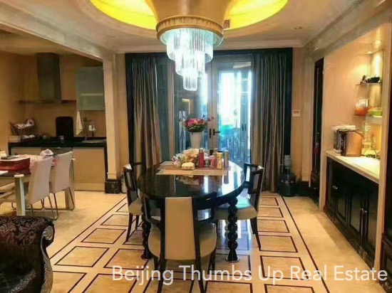 This is a super luxury style apartment located in Star River in Qingnianlu area, Beijing for rent. It has 4 bedrooms with an area of 297 square meters. It is north to south transparent layout, well ventilated and very comfortable. It is luxuriously decorated with super luxury hung ceilings, polished marble floors with different patterns and gorgeous walls. It is fully furnished with deluxe furniture and luxury lamps of different styles. Living in this apartment is like living in a luxury palace. This apartment is for the first time for rent.