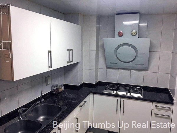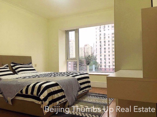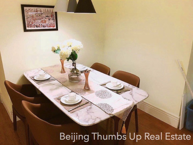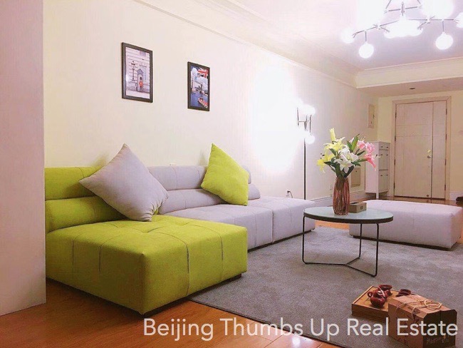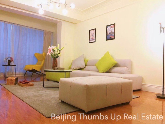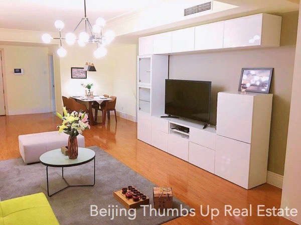 This is a modern simple style apartment located in Palm Springs in Chaoyang Park area, Beijing for rent. It has 2 bedrooms, with an area of 138 square meters. It is southeast facing, on the 5th floor with an easy view of green trees outside. There is a large floor to ceiling window in the living room, good daylight during the day. It is newly furnished with brand new furniture and household appliances.