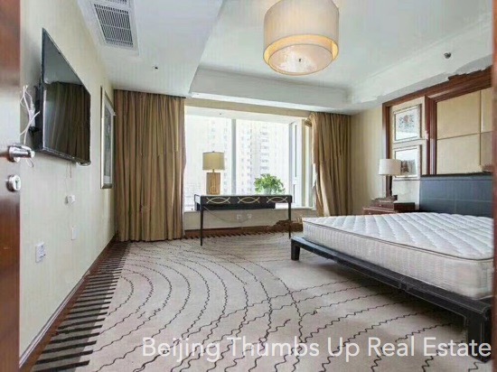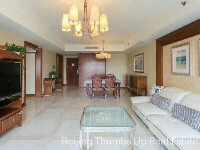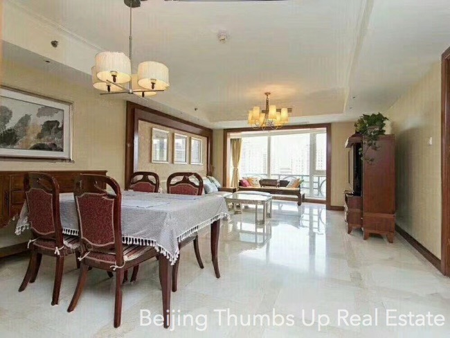This is a Chinese style apartment located in Palm Springs in Chaoyang Park area, Beijing for rent. It has 1 bedroom, 1 living room, 1 dining room, 1 kitchen and 1 bathroom, covers an area of 123 square meters. It is fully furnished with a full set of Chinese style furniture. The lamps and murals are full of Chinese elements. The living room, dining room and bedroom have good daylight, the rooms are very bright during the day. The living room and dining room are polished marble floors, and the bedroom is carpeted. Every room is spacious and in good condition.
