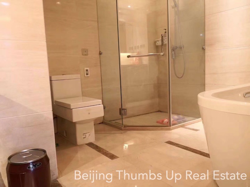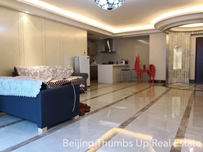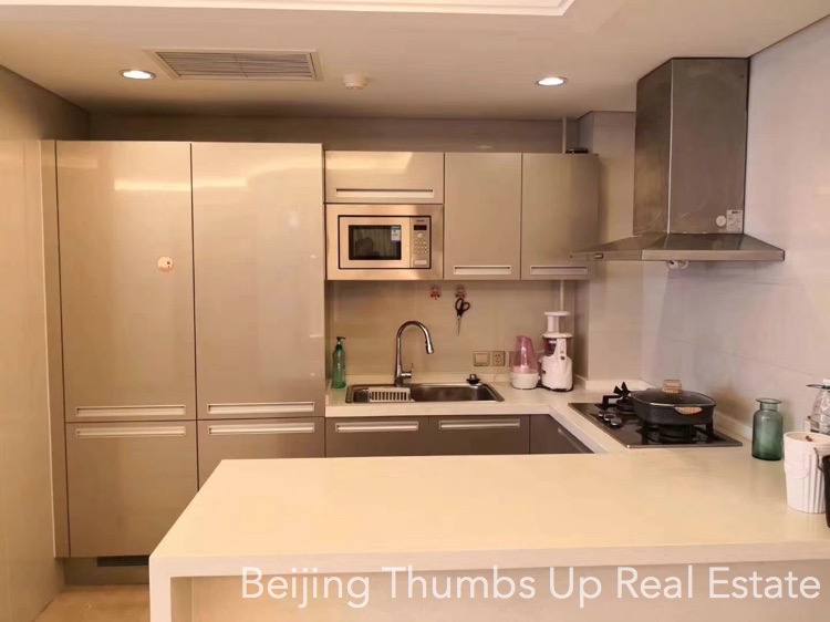 This is a semi luxury style apartment located in Shoukai Bojun in Beijing Sanlitun for rent. It has 1 bedroom, covers an area of 127 square meters. This apartment is south facing, on the high floor with an unbeatable view. It has an entrance hall with a round hung ceiling, gorgeous walls and a polished marble floor with patterns. The living room is luxury and spacious, and there is an area deep in the living room, which can be used as a leisure area, very relaxed and satisfied. The kitchen is open style, and the fridge in the kitchen has a super large capacity with double doors. The bathroom is big size, very comfortable.