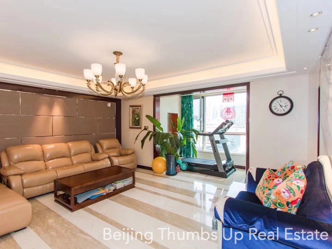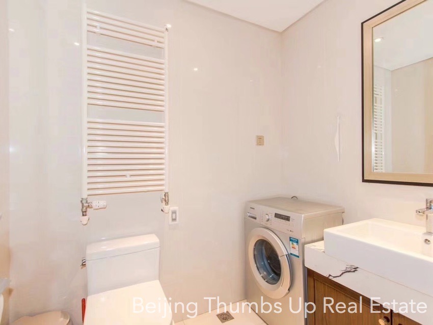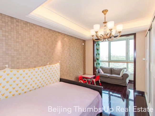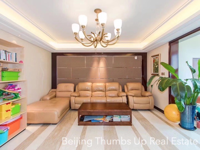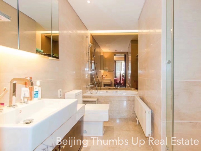 This is a luxury style apartment located in Shoukai Bojun in Beijing Sanlitun for rent. It has 3 bedrooms with an area of 197 square meters. It is luxuriously decorated with luxury suspended ceilings with lighting effects, polished marble floors with milky white and light yellow stripe patterns, luxury soft packed wall, polished marble walls and polished marble washbasin and bathtub countertops. It is fully furnished with high grade and expensive furniture, elegant artistic lamps and valuable murals. It faces north, south and east. It is transparent layout, well ventilated and good lighting. It has a fresh air and water purification system. Besides, this apartment has a leisure area in the deep of the living room and every bedroom with a large window, very relaxed and good sunlight during the day.