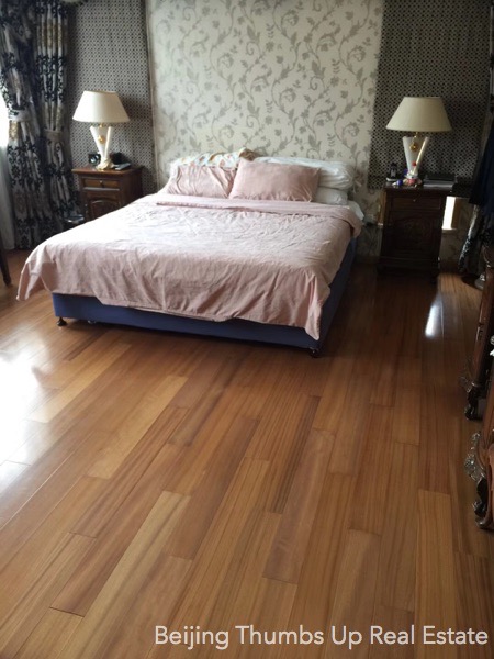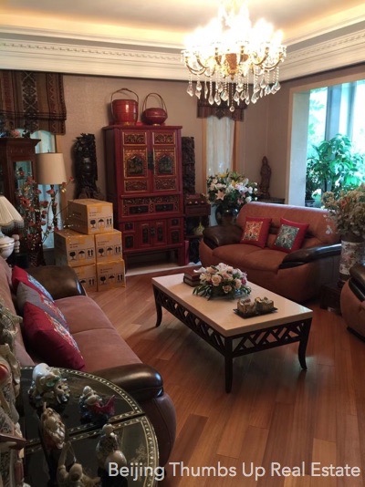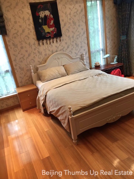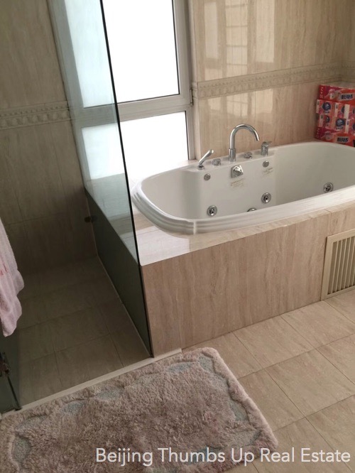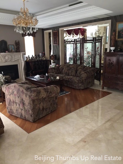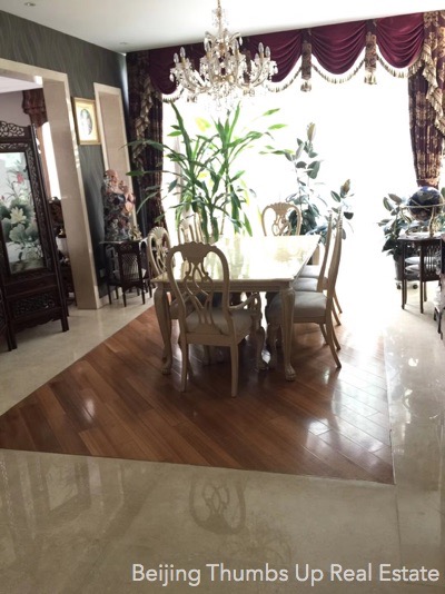 This is a single family villa located in Rits Garden Villas in Shunyi, Beijing for rent. It is 2 stories high with a basement. It is fully furnished with high end furniture and household appliances. The ceilings of the living room and kitchen are luxury hung ceilings with luxury lamps, very noble and luxury. The floors of the living room and dining room are very unique, with log solid wood floor in the middle and polished marble around. The curtain in the dining room is very beautiful, together with the artistic lamp, the folding screen of Chinese style and the precious ornaments make the dining room very noble and elegant. The kitchen has an oversized stone workbench, convenient for cooking. There is a sauna room and a massage bathtub in the master bathroom. This villa has floor heating in winter.