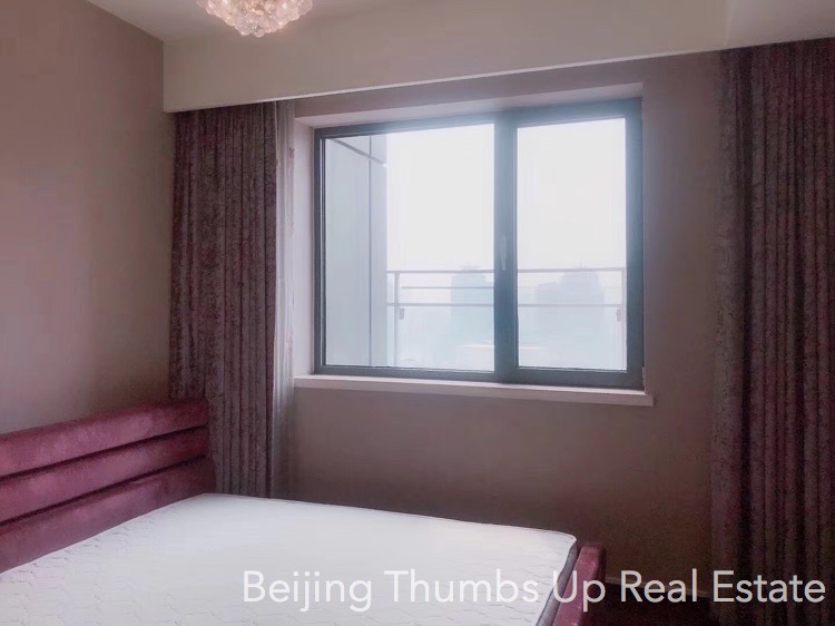 This is a modern simple style apartment located in Mixion Residence in Lufthansa area, Beijing for rent. It has 3 bedrooms and 1 study room with an area of 245 square meters. A remarkable feature of this apartment is its decoration and configuration are very simple and smooth, making people feel very comfortable. In addition, this apartment has the following advantages: 1. It is lit on 3 sides. 2. It is on the high floor, the view is great. 3. It is transparent layout, well ventilated and very comfortable. 4. The dining room and kitchen are very spacious, and the artistic lamp in the dining room is very attractive, like a water curtain. 5. The fridge in the kitchen is a super large one with double doors.