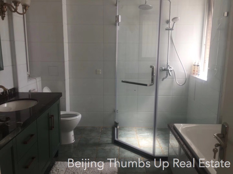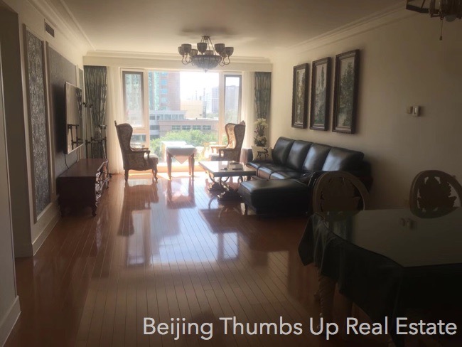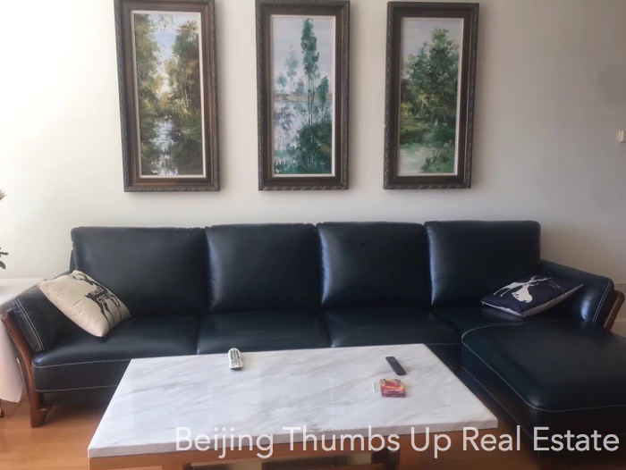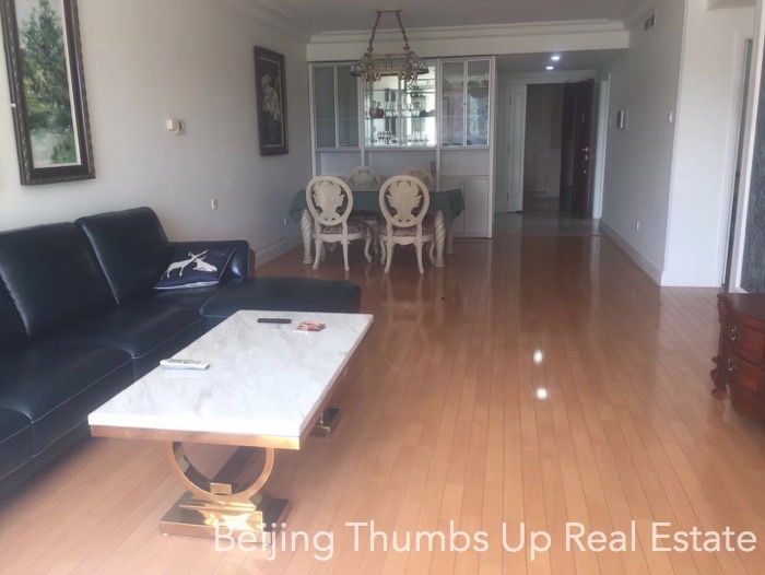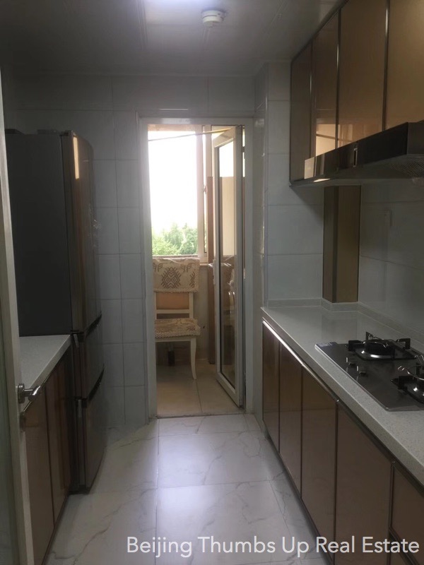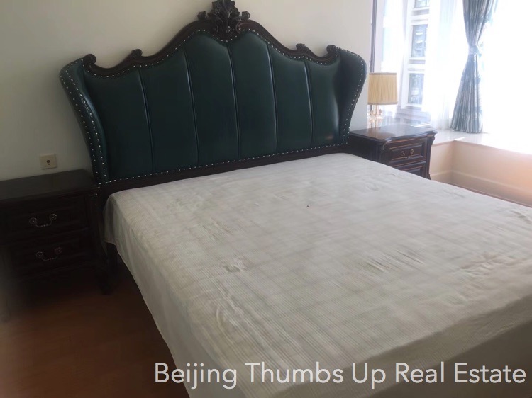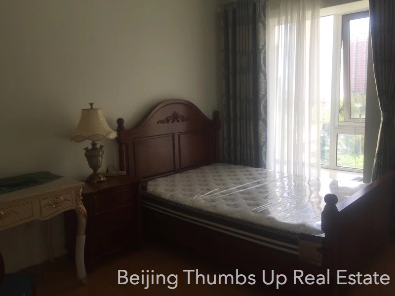 This is a European style apartment located in Palm Springs in Chaoyang Park area, Beijing for rent. It has 2 bedrooms with an area of 137 square meters. It is south facing, on the low floor, fully furnished with all necessary furniture. The living room has a large floor window, and faces the atrium garden of the community, the view is great. There is a bright laundry room near the kitchen.