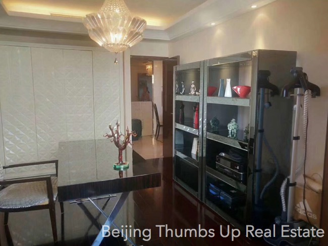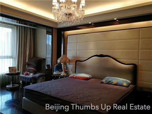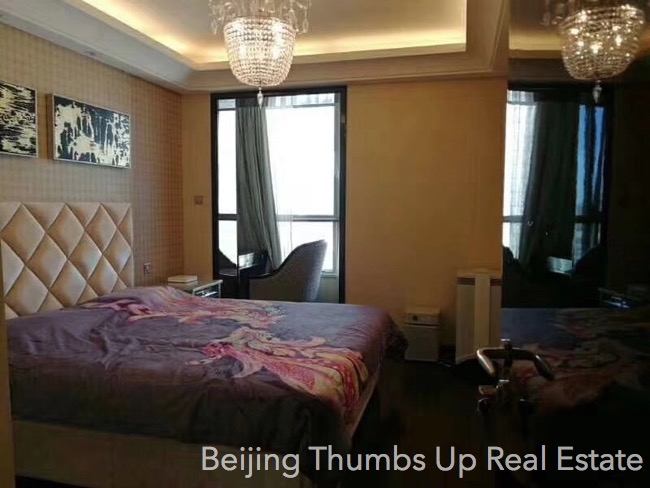 This is a luxury style apartment located in Shoukai Bojun in Sanlitun area, Beijing for rent. It has 3 bedrooms with an area of 197 square meters. It has luxury suspended ceilings with luxury lamps, luxury walls of different styles, polished marble floors with patterns, solid wood floors, luxury furniture, valuable murals and high quality brand household appliances etc.